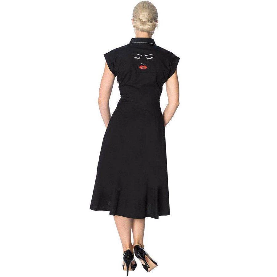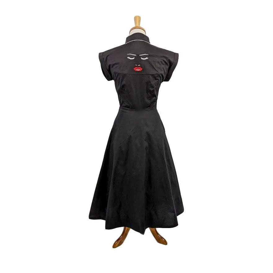 Great rockabilly dress from Banned with a diva model face design in red and white on solid black. The dress has that diner look with a fold-over collar, non-functioning buttons up the front, and short cap sleeves. There’s a great face design embroidered on the back. Zips up the side.