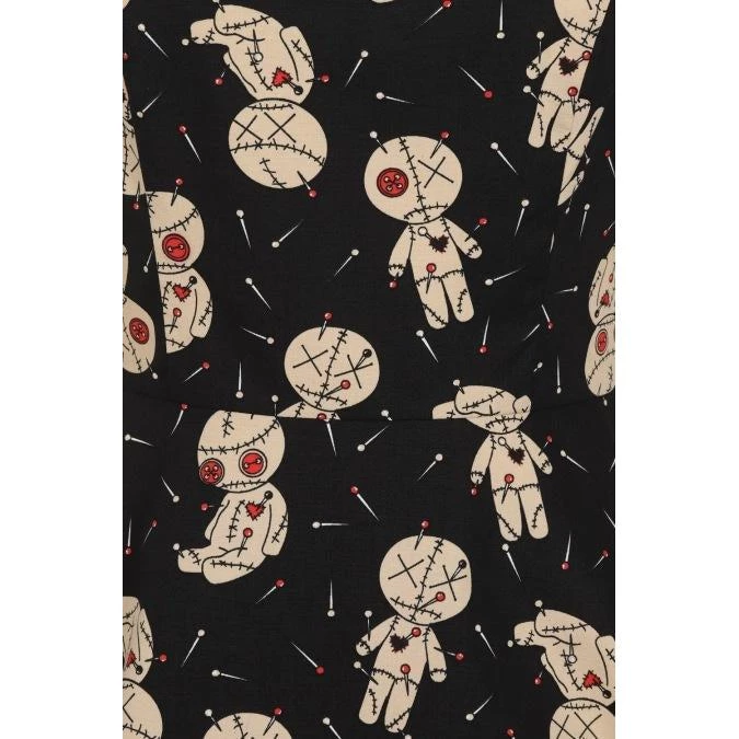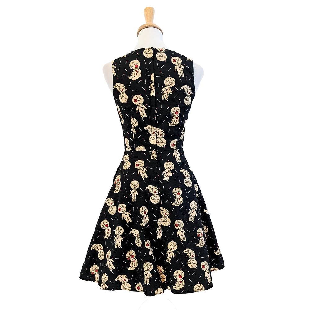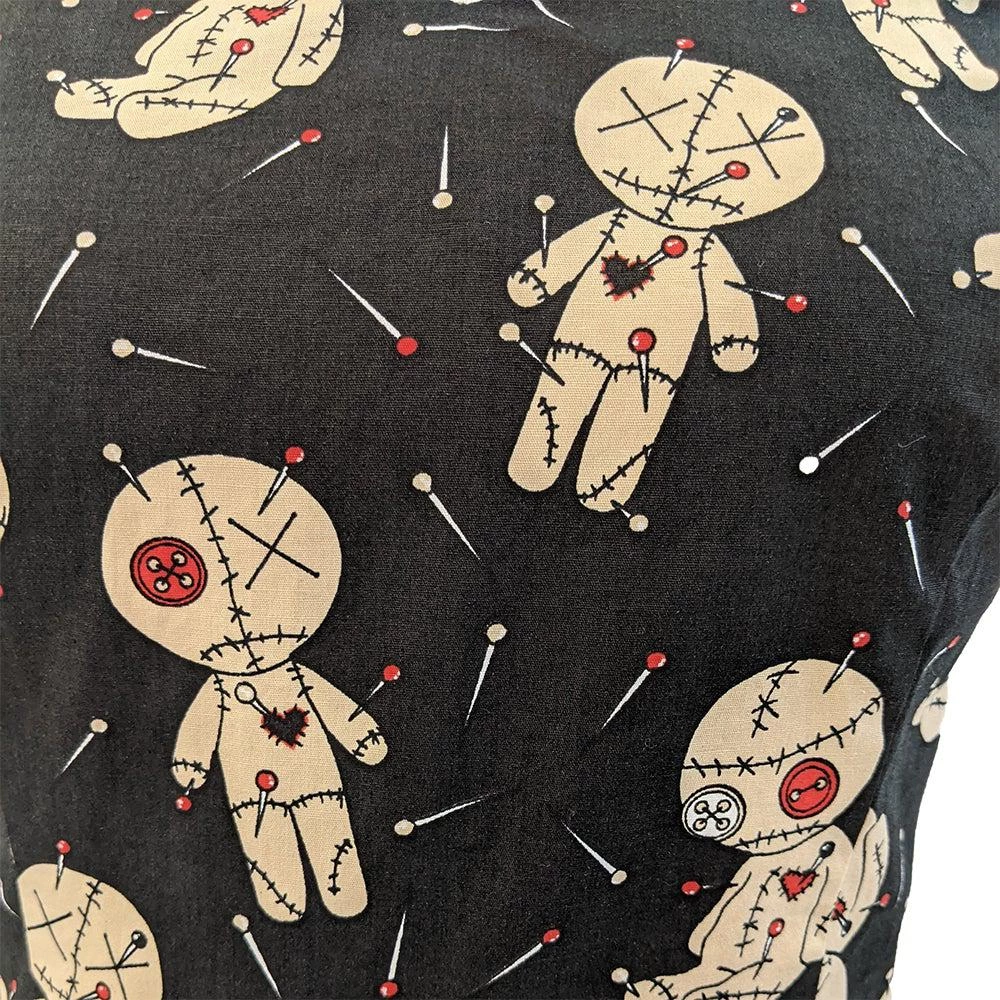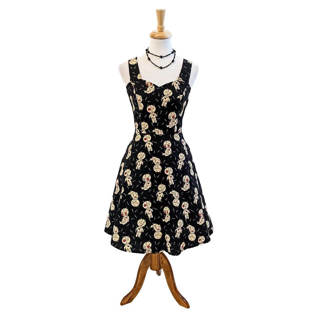 Sometimes you just need a few voodoo dolls and some alone time to straighten things out….and this is the perfect dress for that time. This sleeveless dress features a wonderful print of voodoo dolls on a black background. It has a sweetheart neckline, flattering vertical bodice seams, and a nipped-in waist above a circle skirt. It has side seam pockets and zips up the back.