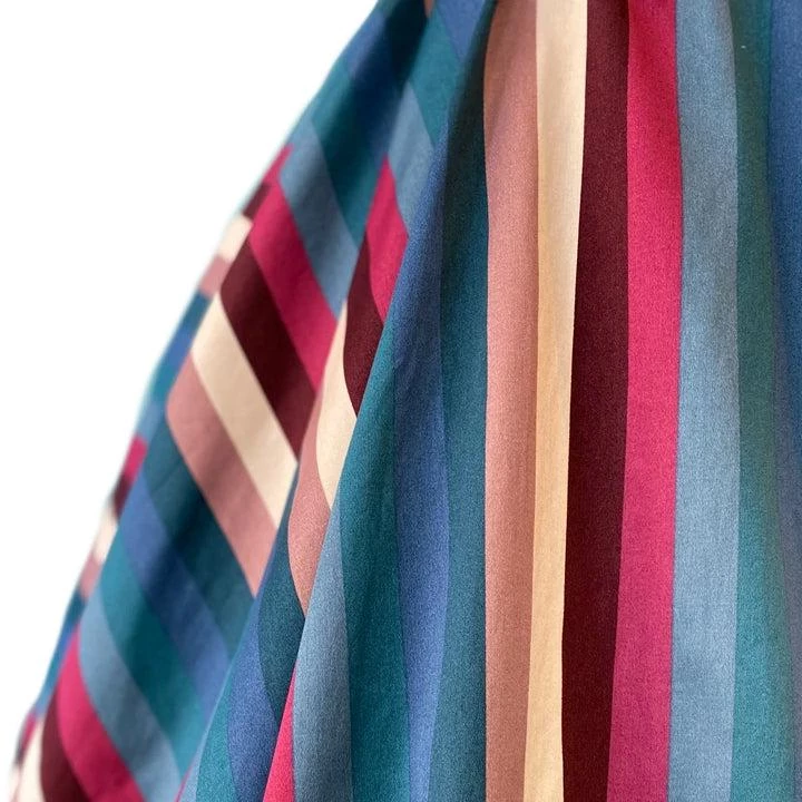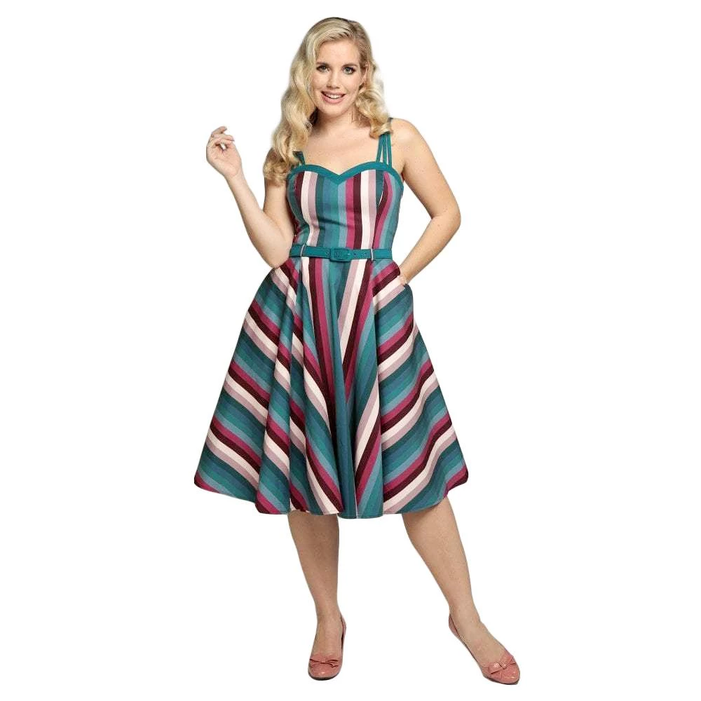 Treat yourself a little piece of paradise with the Nova Paradise Stripe Swing Dress! It’s printed with vertical stripes in beautiful sunset shades to have you dreaming of island holidays. It’s a fun, classic swing dress shape with a gorgeous sweetheart neckline that has a wide bordered edge and adjustable triple shoulder straps. A matching belt cinches and accentuates the shape. The dress features handy side-seam pockets and fastens at the back with a matching nylon zip.Â