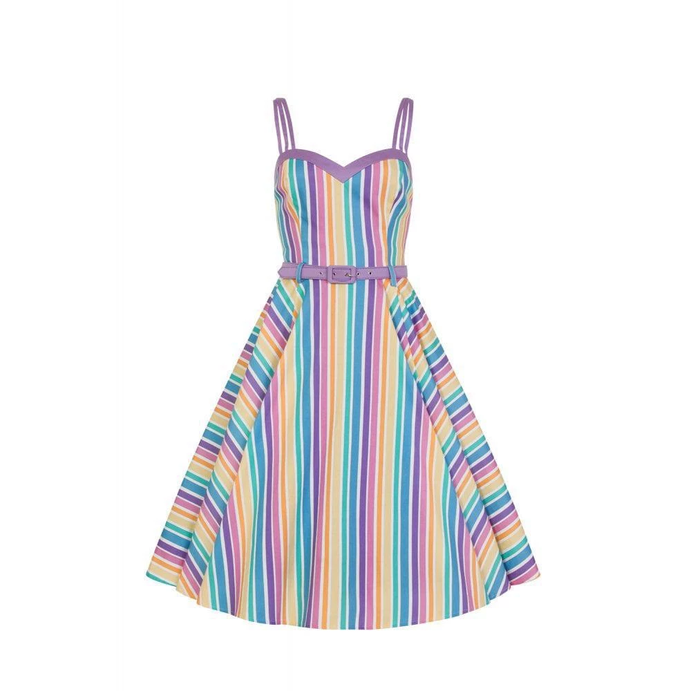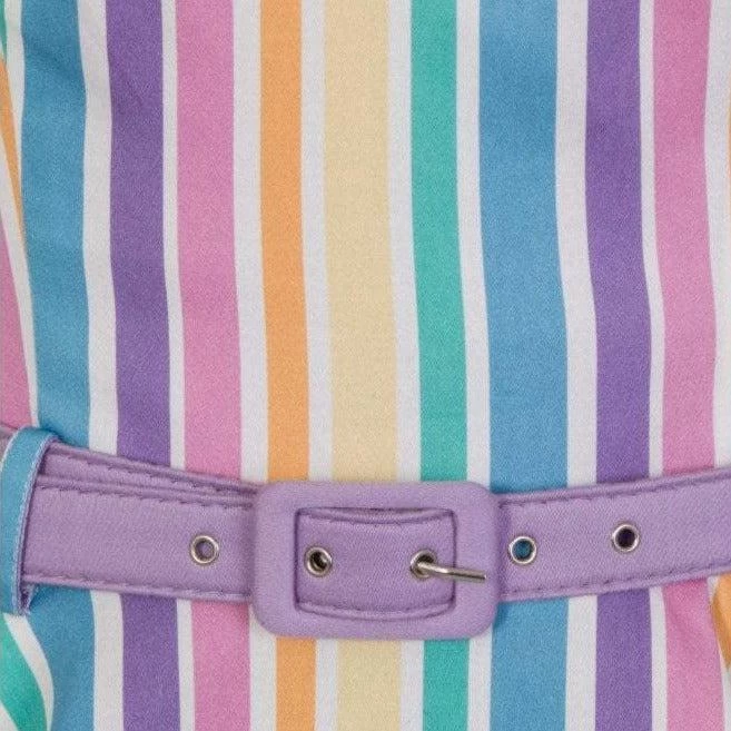 The clouds have disappeared, the sun has come out and from above the Nova Rainbow Stripe Swing Dress has emerged! It’s fabulously fun and it features pretty pastel stripes in an array of rainbow colors! With a gorgeous sweetheart neckline with a wide bordered edge to match all the trimmings; including the adjustable triple shoulder straps and the pastel purple waist belt to cinch accentuate your shape. Complete with practical side-seam pockets and fastens at the back with a hidden zipper.
