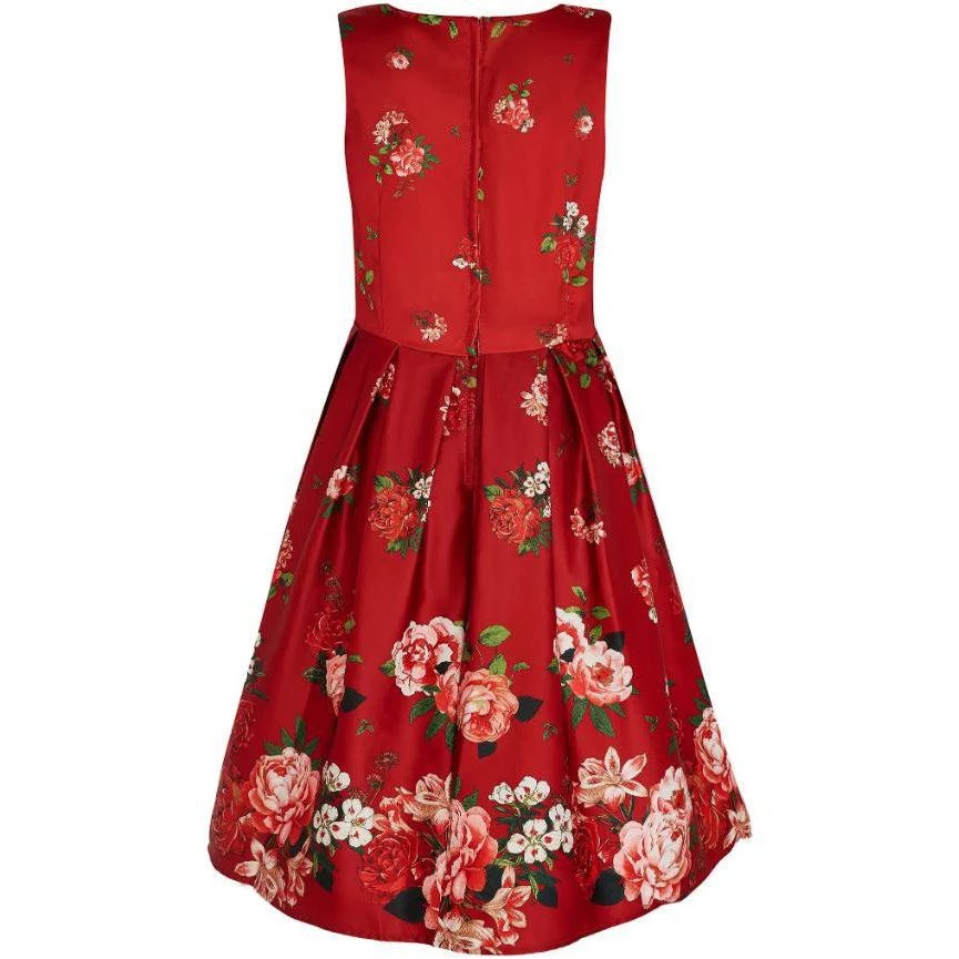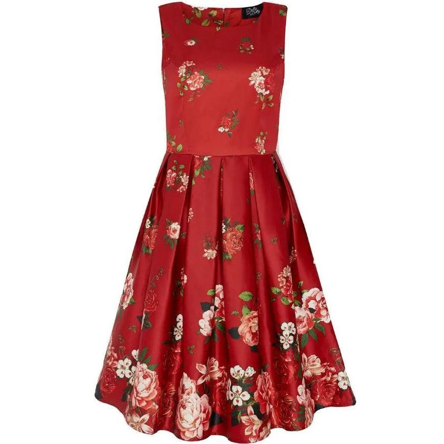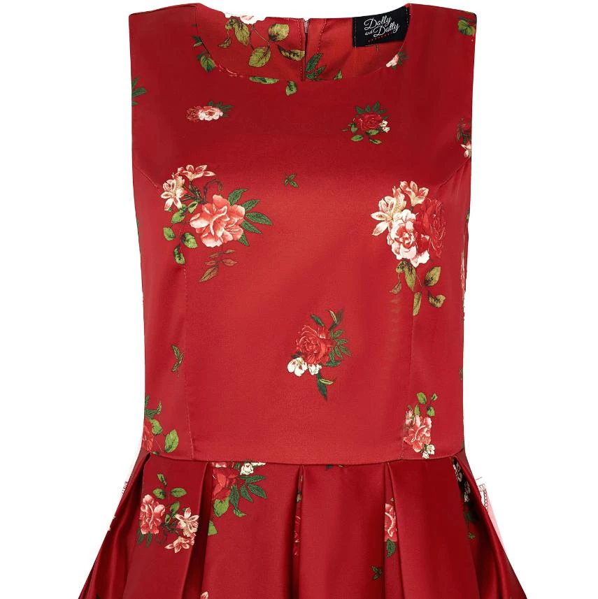The Annie is a gorgeous pinup-girl-style dress from Dolly & Dotty that has been cut to compliment your curves! The retro frock features a lovely flattering fitted bodice, a simple bateau neckline, a 50s full circle swing skirt with box pleats, and it has side seam pockets. Made from a lovely floral chintz print on a burgundy red background, this dress has a smooth and fabulous fit.