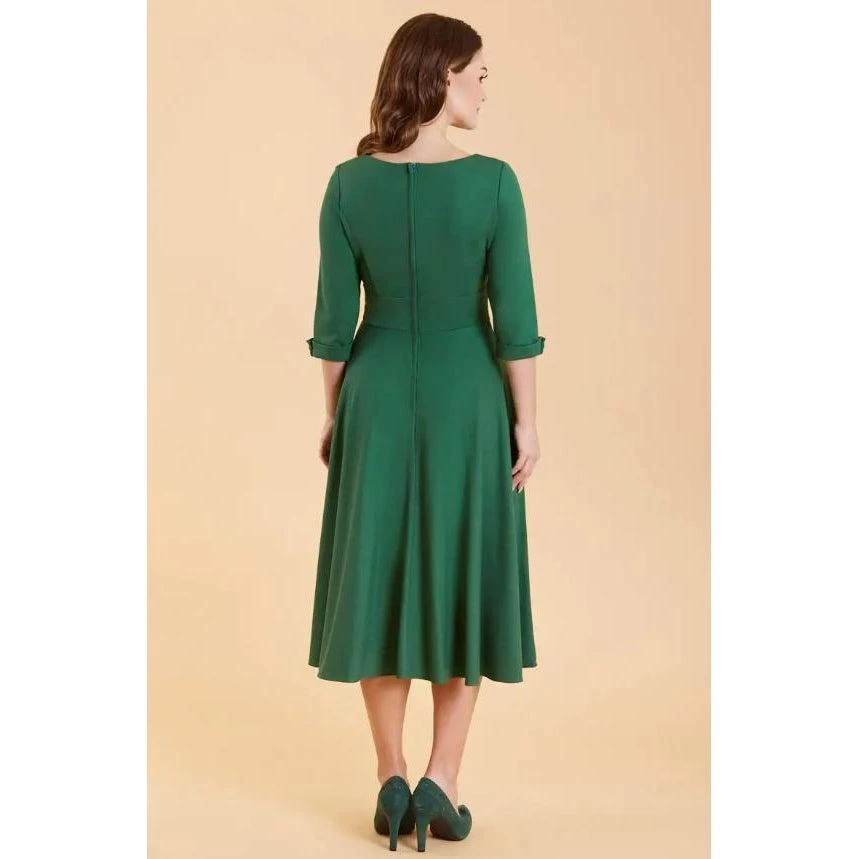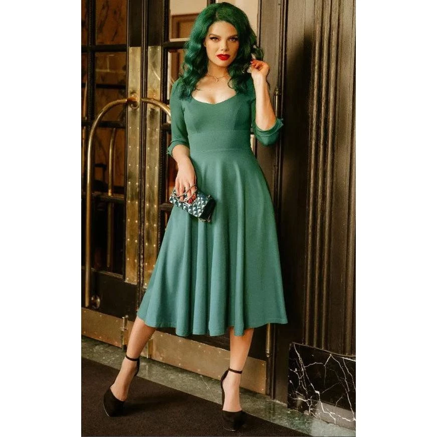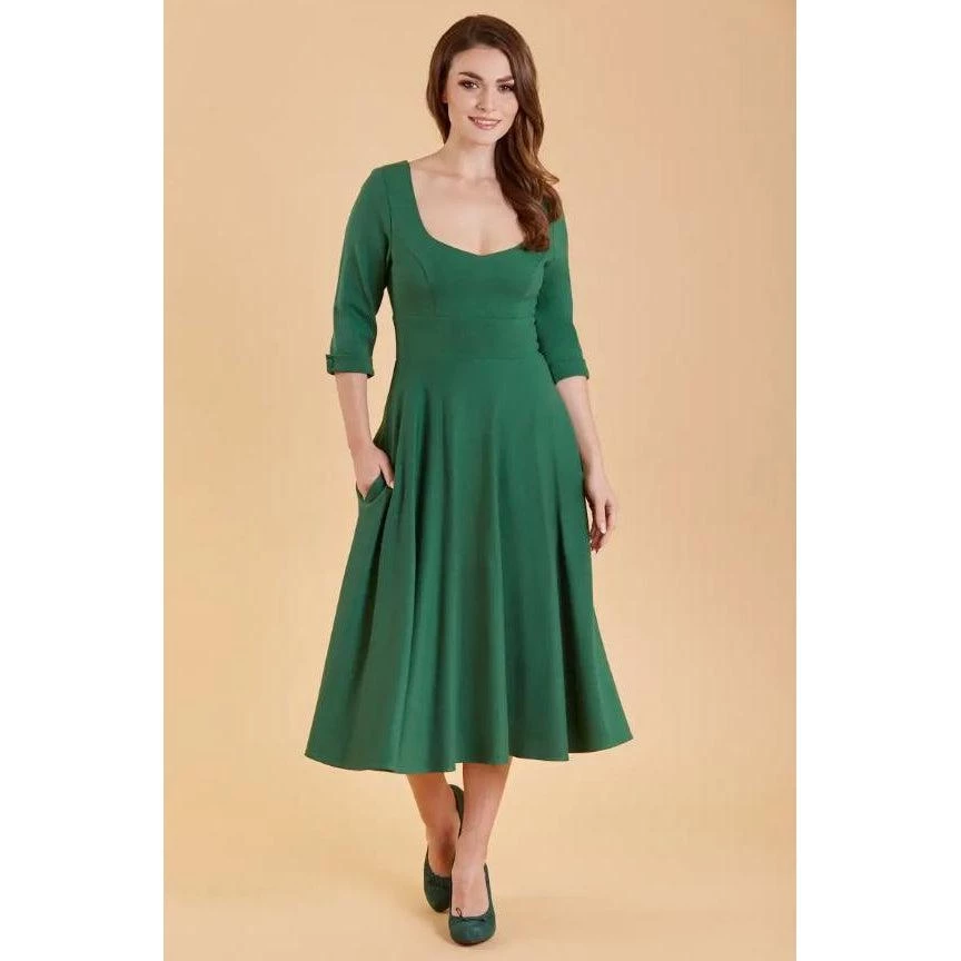 The Scarlette dress from Dolly & Dotty is so comfortable & stretchy, it is a must have for your wardrobe! It features a fitted bodice, a sweetheart neckline, 3/4-length sleeves with cuff detailing, a classic full circle skirt, and a hidden back zip. The hidden side seam pockets are large enough for your mobile phone and wallet! This sumptuous dress is made of Ponte Di Roma, a very luxurious  and super soft, comfortable fabric.