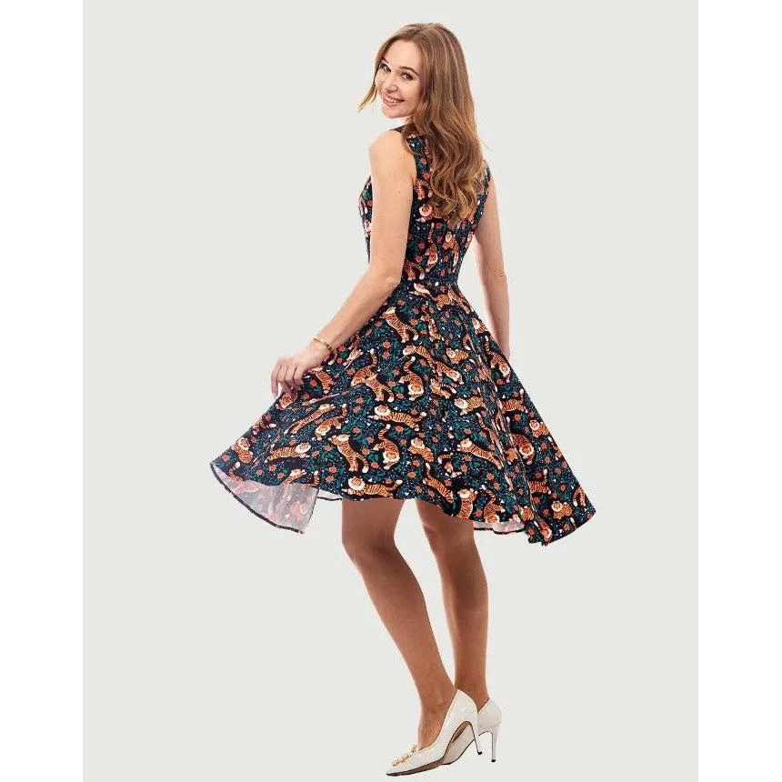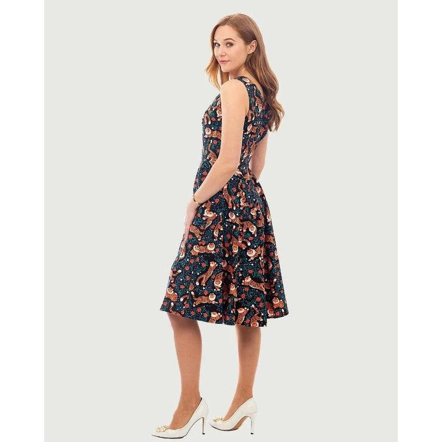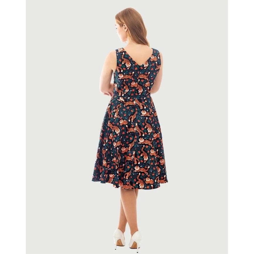 You can be a hunter bold in this beautiful fit-and-flare dress from Eva Rose!  Made of a supple and sturdy fabric with majestic tigers woven through a jungle of flowers on a black background, the sleeveless dress has very flattering lines with princess seams in the bodice, a V-neckline front and back, and a very full skirt with box pleats that fan out from the center. The high waist seam gives it a very nipped-in look and it has side seam pockets. Zips up the back.