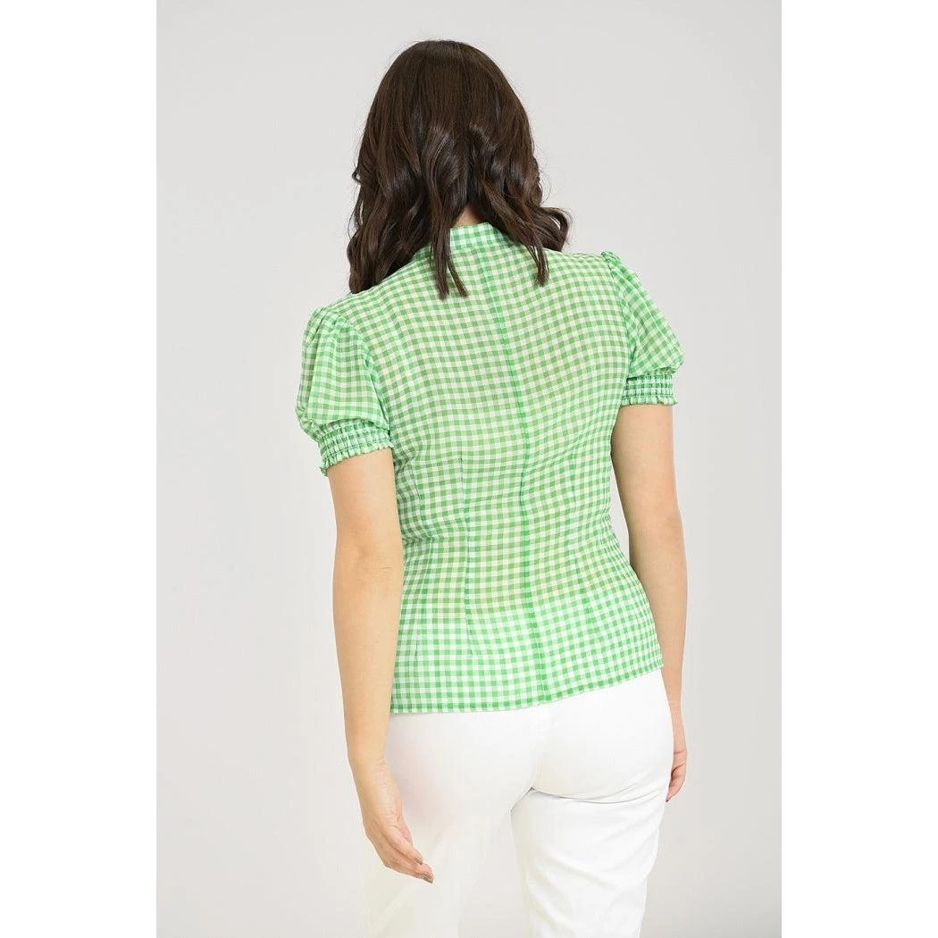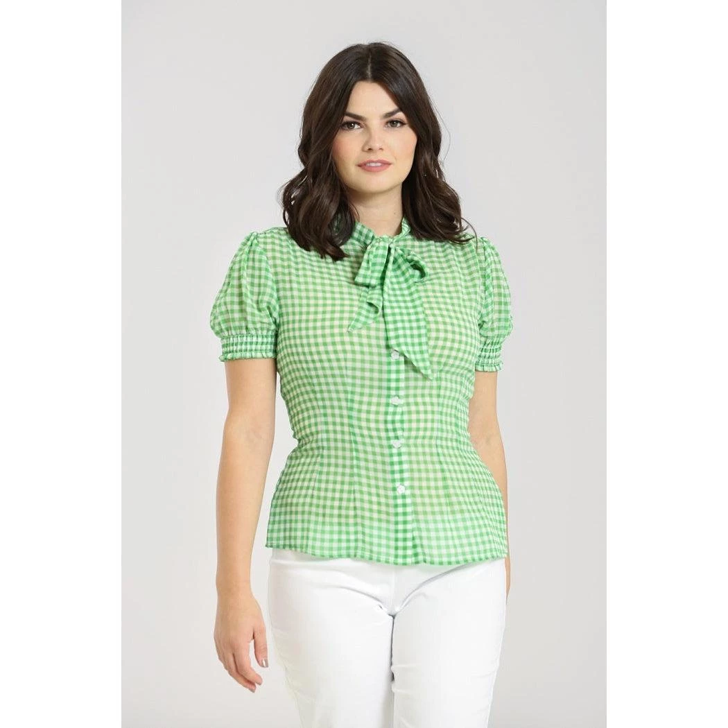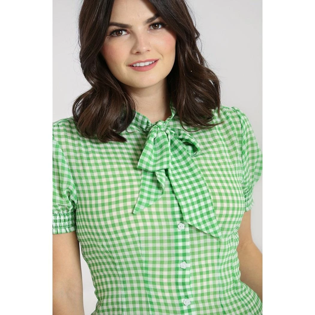 You’ll know spring has sprung when you wear the Anne Marie blouse from Hell Bunny in this charming grass green gingham fabric. The semi-fitted blouse has a large pussy bow, short slightly puffed sleeves with elasticized cuffs, and sweet pearlized white flower buttons up the front. This blouse reaches the hips and can be worn tucked in or out.