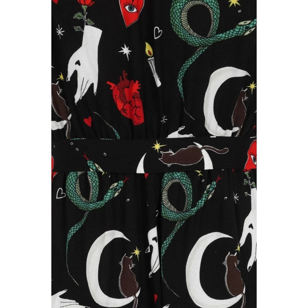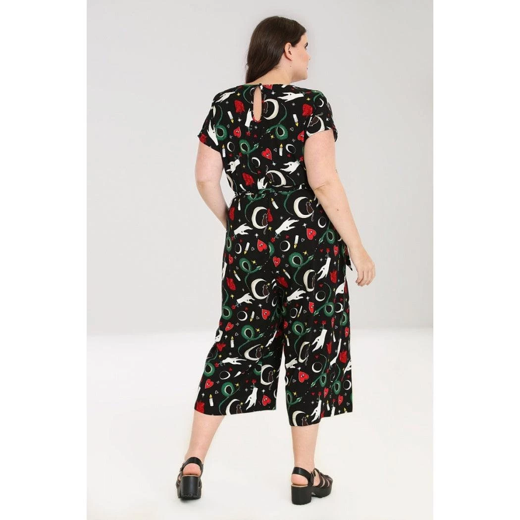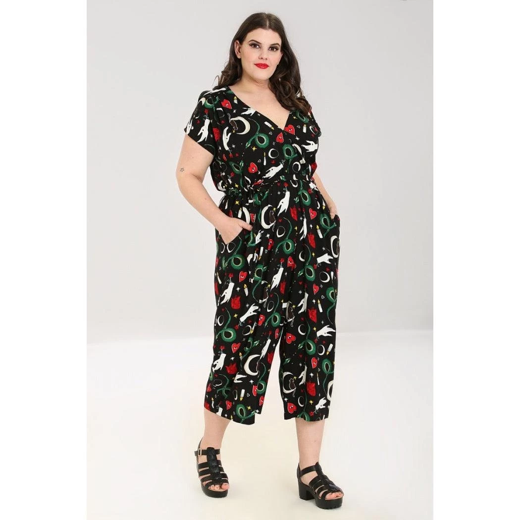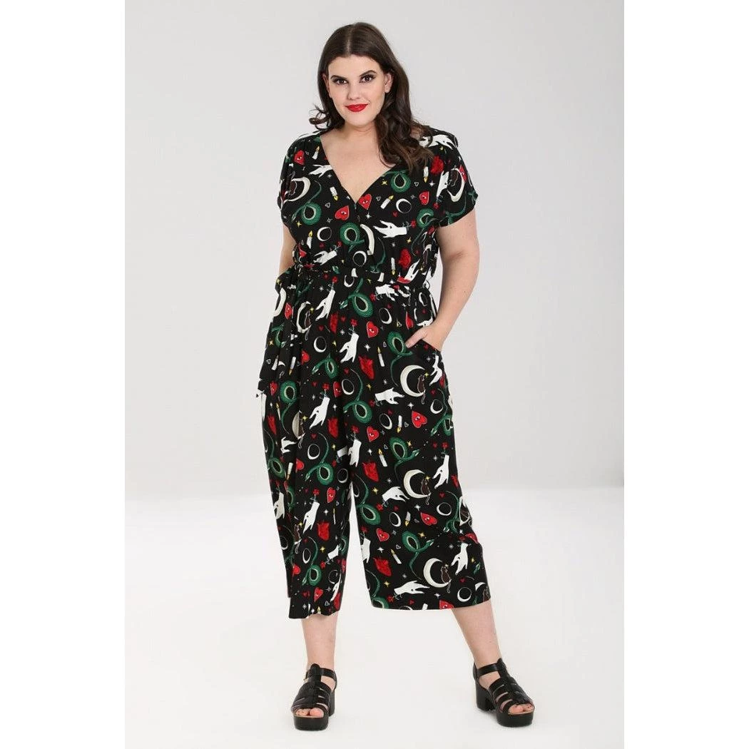 Fortunately, Hell Bunny has the cutest jumpsuit ever–just for you!! The fabulous print features snakes, moons, candles, and cats on a black background. The sleeveless wrap top gathers on a front yoke. The waist is elasticized for comfort. There’s a keyhole opening on the back, and the legs are culotte-length and flared from the waist. There are side seam pockets.