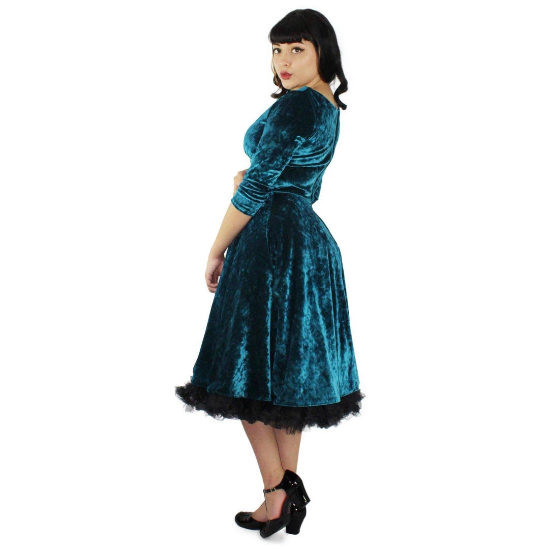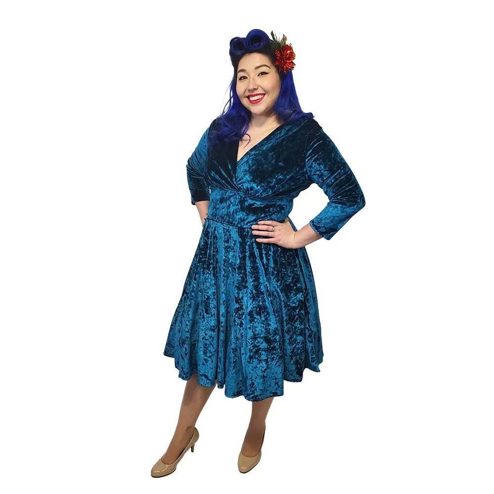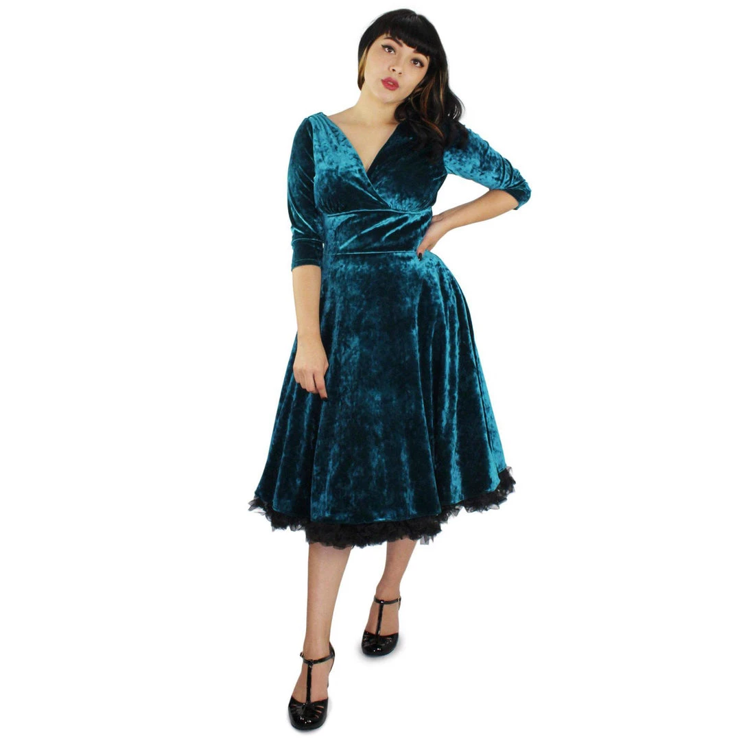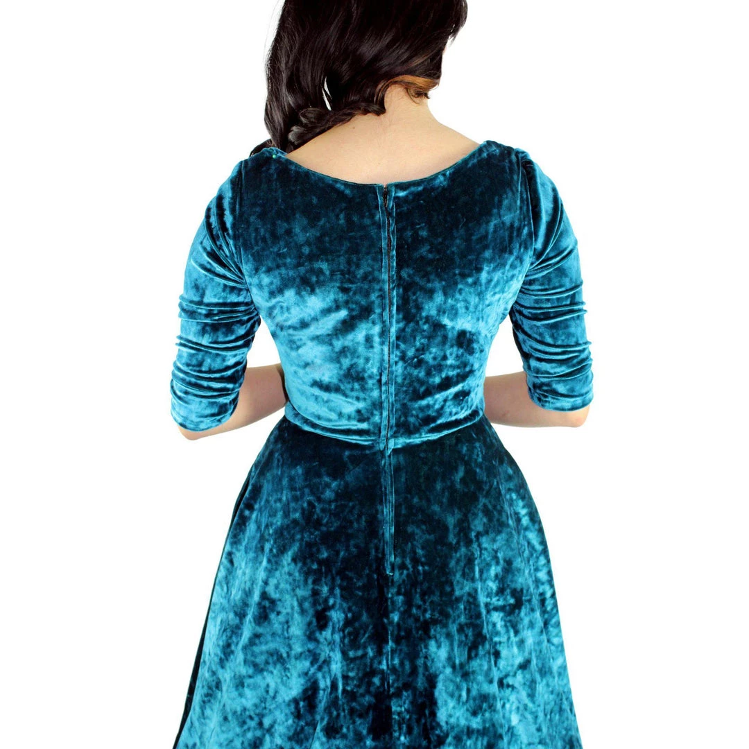 This beautiful dress has a lovely wide v-neck that plunges in the front and gives the back of the dress a nice curve in the back neckline. It has three-quarter sleeves that gives a cinched look at the top of the shoulders with a wide waistband to accentuate your curves. Zips up the back.