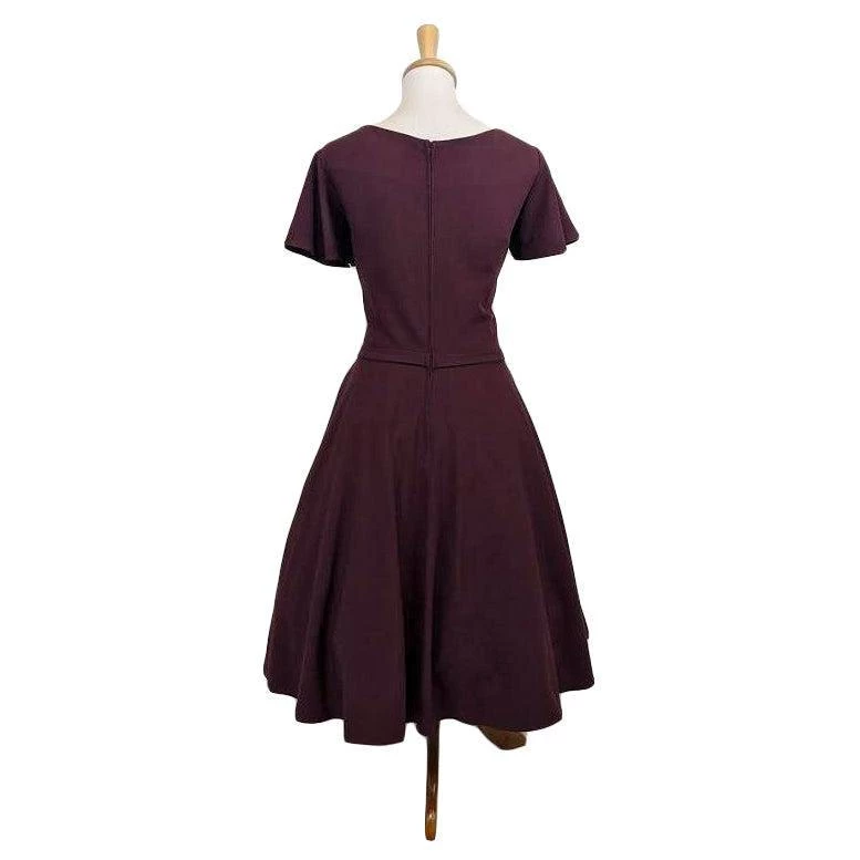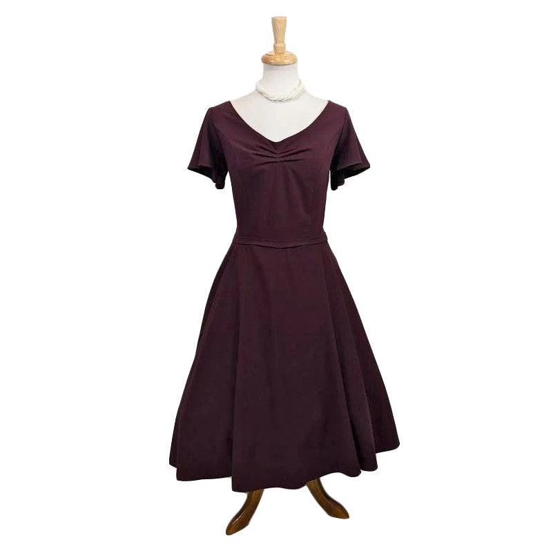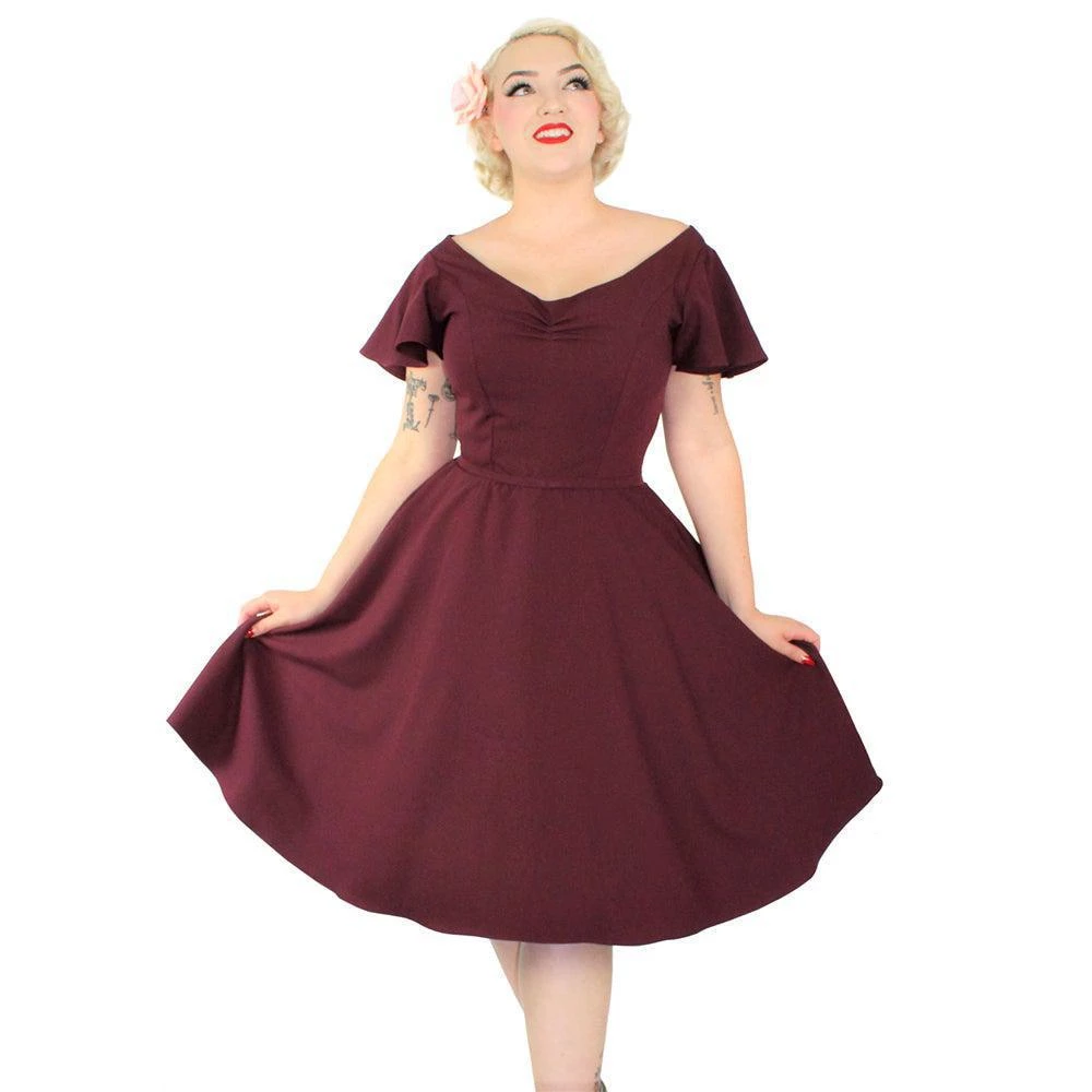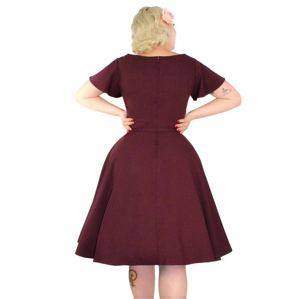 Step out in style with this gorgeous 50’s-inspired burgundy swing dress from Hemet! The light and flowy material make this dress perfect for twirling and comfy all year round. The dress features short butterfly sleeves, a V-neck with gathers at the bust, a full swing skirt, side seam pockets, and an attached slim belt. Zips up the back.