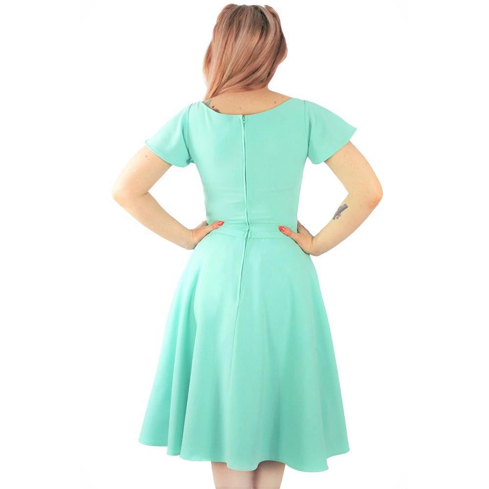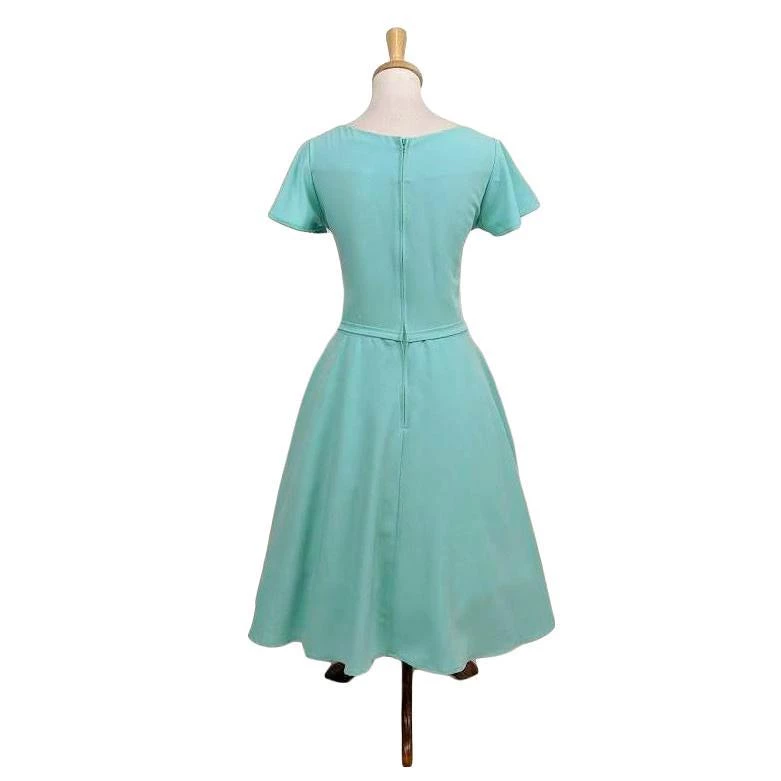 Step out in style with this gorgeous 50’s-inspired mint green swing dress from Hemet! The light and flowy material make this dress perfect for twirling and comfy all year round. The dress features short butterfly sleeves, a V-neck with gathers at the bust, a full swing skirt, side seam pockets, and an attached slim belt. Zips up the back.
