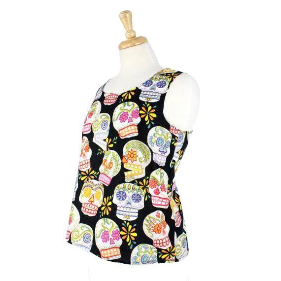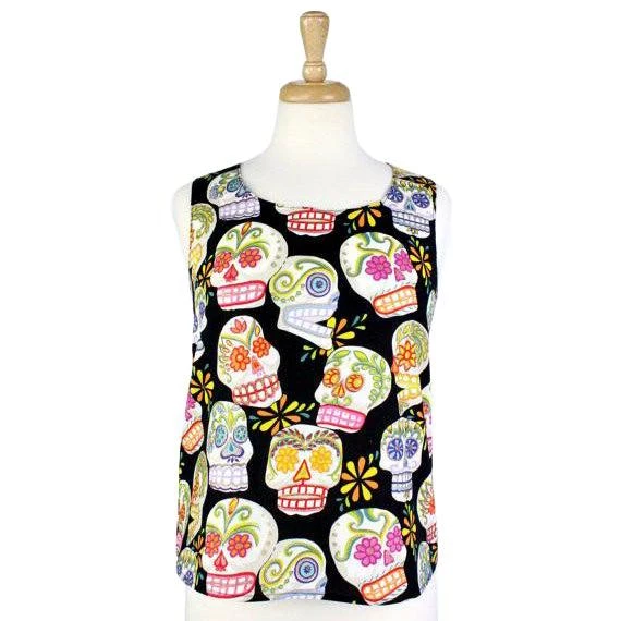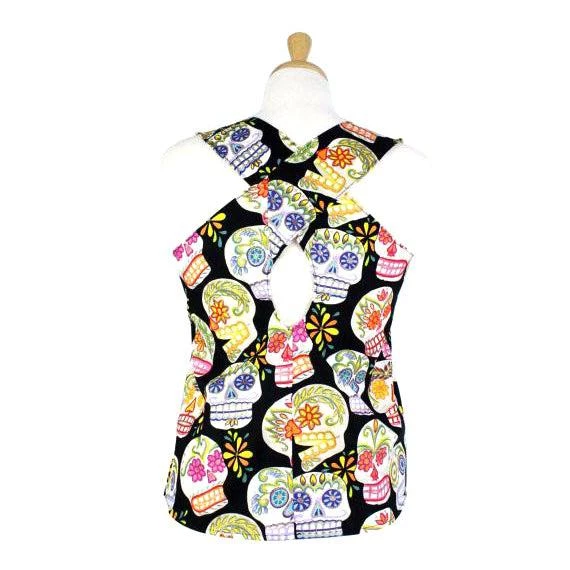Hemet’s sugar skull top is going to be your next comfy favorite, with a vivid sugar skull print on black and interesting criss-cross details at the back. Pair it with jeans and a hair flower for a flirty rockabilly look. Perfect for Halloween, Day of the Dead, or all year round.