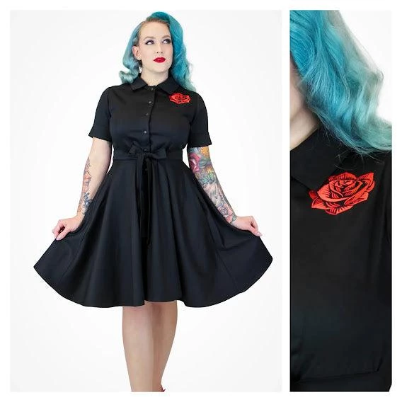 Step into the 1950s in this adorable dress fit-and-flare dress from Hemet.  This dress is appropriate for both casual and formal events with its sweeping circle skirt and eye-popping red rose embroidered on the left bodice. The short sleeves are cuffed, an attached belt cinches the waist, and there are side seam pockets. Twirl away in this beautiful dress, and add a petticoat to take it absolutely over the top. The dress hits at the knee; measured from the waist down it is 22″ in length.