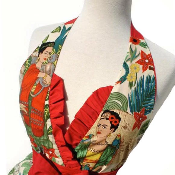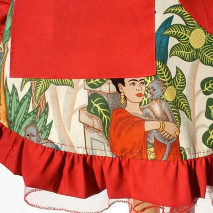 This gorgeous halter-style apron will bring a pop of color and cheer to any kitchen! This apron features Frida among some of her favorite things: monkeys, parrots, sacred hearts, and flowers against a tropical forest background, with cherry red trim for a pop of contrast. Lengthy straps around the neck and waist make this apron amazingly adjustable. Tie at the back or wrap around to the front to make a sweet bow. It’s shown over a red tutu, not included.