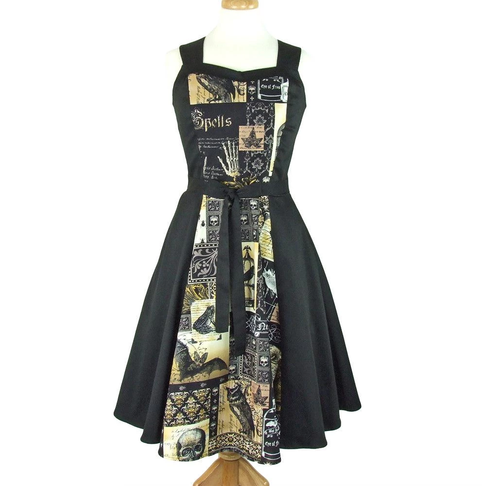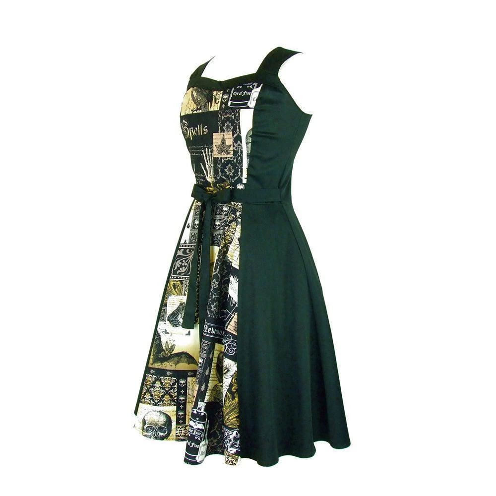 This stunning sleeveless dress features artwork inspired by Edgar Allan Poe’s classic gothic poem, “The Raven.” This intricate and eye-catching print of ravens, skulls, and creepy crawlies is paired with black panels to the sides of the garments for a slimming colorblock effect. The fitted bodice and full circle skirt give it a super flattering shape for any figure. Fully lined top, full back zipper, knee length skirt. Made in the USA