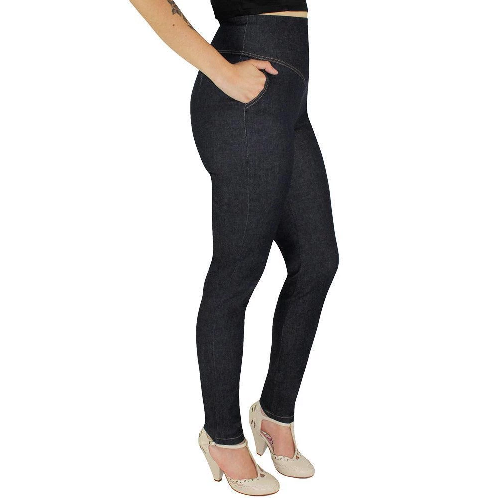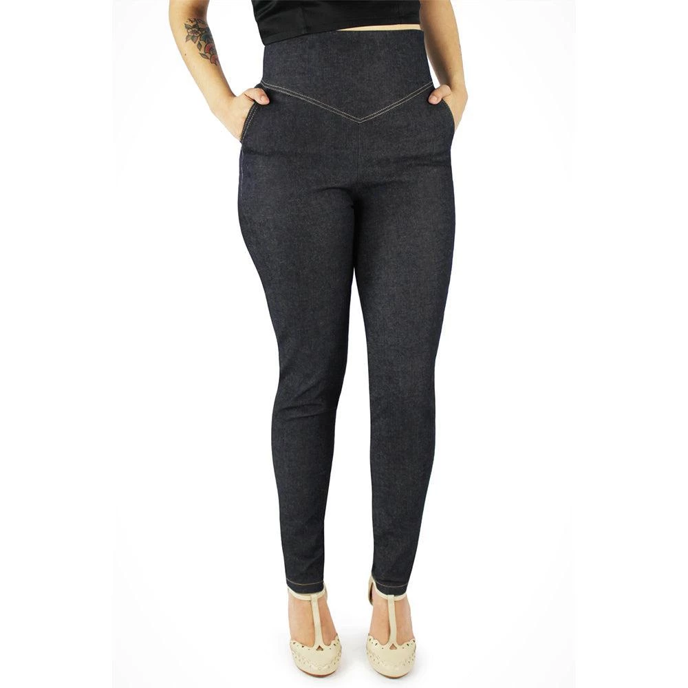Pair this amazing blue high-waisted pant with any top. The material is thick, hugs your body nicely, and is long enough to cuff rockabilly-style. Pair with your Chucks, heels, or strappy flats.  This sturdy and stylish denim-like material gives you the blue jeans look with leggings comfort! Back zip; handcrafted in the USA.