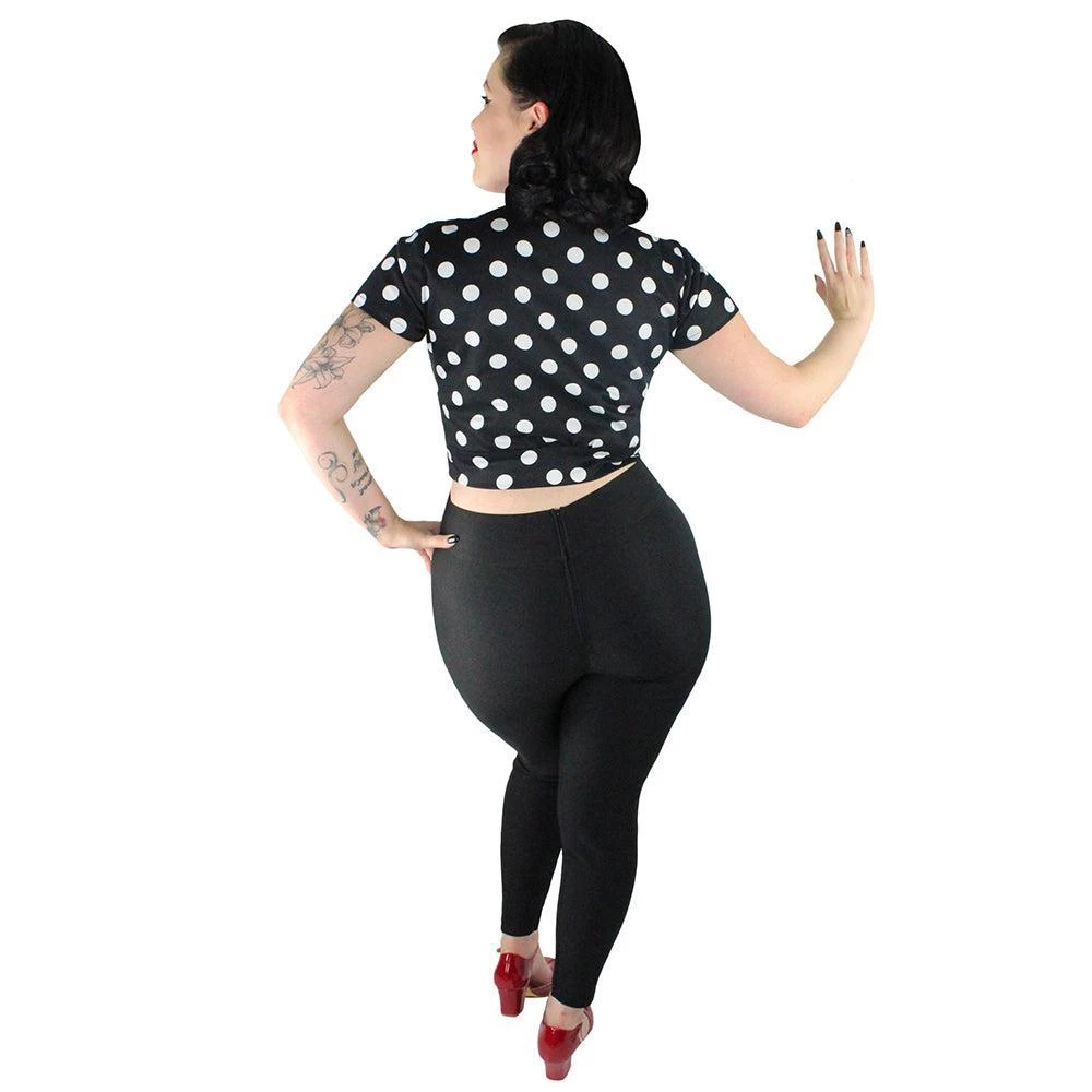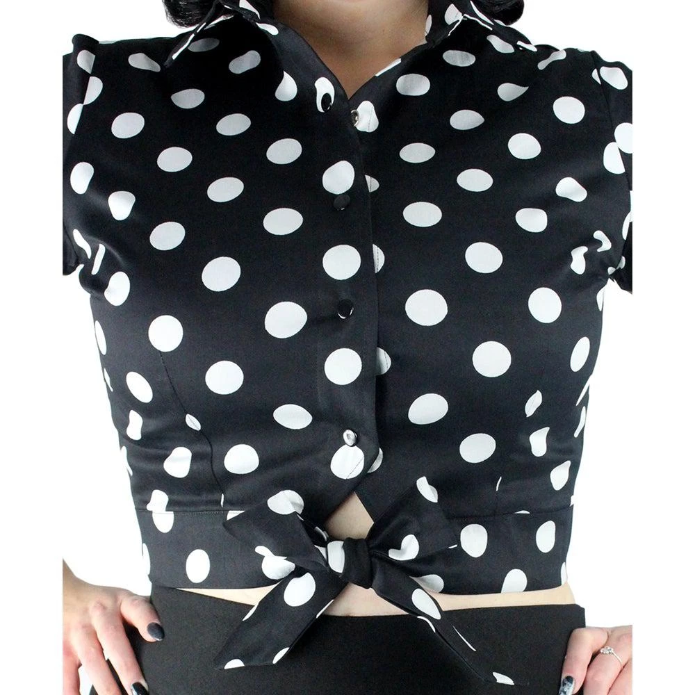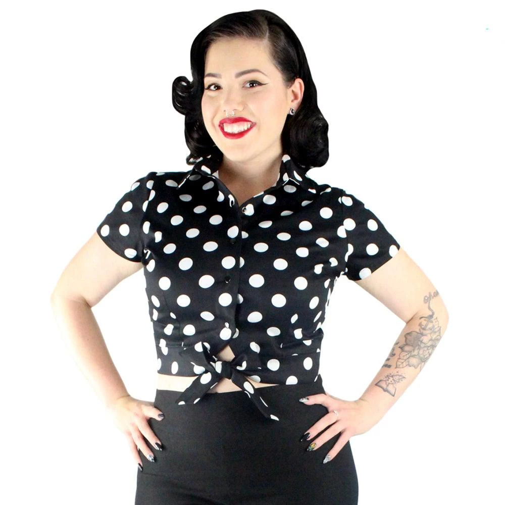 This adorable ’50s-inspired knotted blouse is the perfect topper for your high waist capris and fab retro circle skirts. It features a peter pan collar, short sleeves, and straps to tie into a bow at the front, all in a cheery black and white polka dot print! The snap up closure makes it easy to dress and easy to style by snapping all snaps or leaving one or two open. Made in the USA.