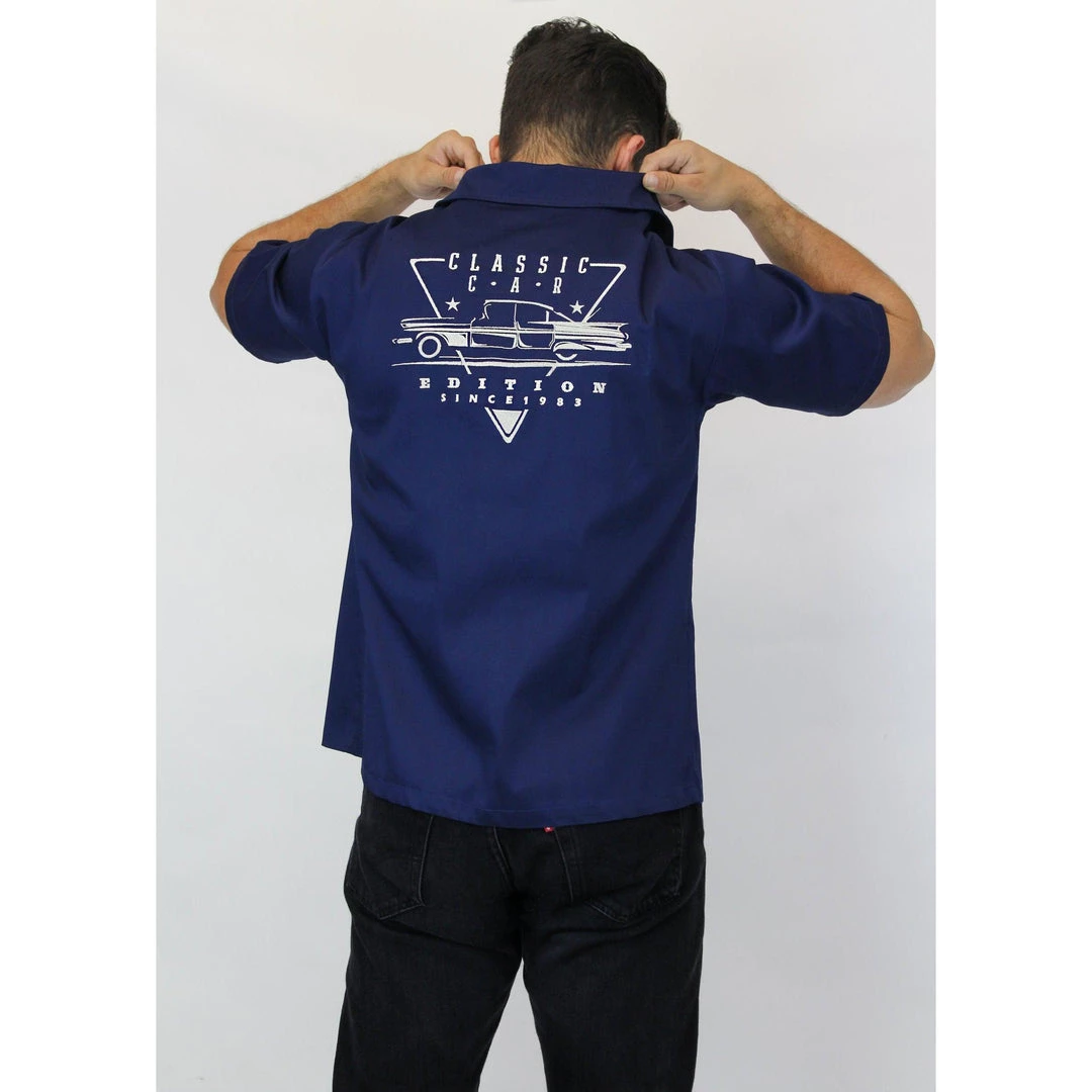 The universal work shirt in a beautiful deep blue with large embroidery on the back featuring a classic car— emblem of the vintage culture—perfect for the vintage-loving man.  The collared shirt has short sleeves, a front pocket, and snap-up closure. Â