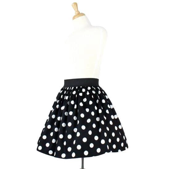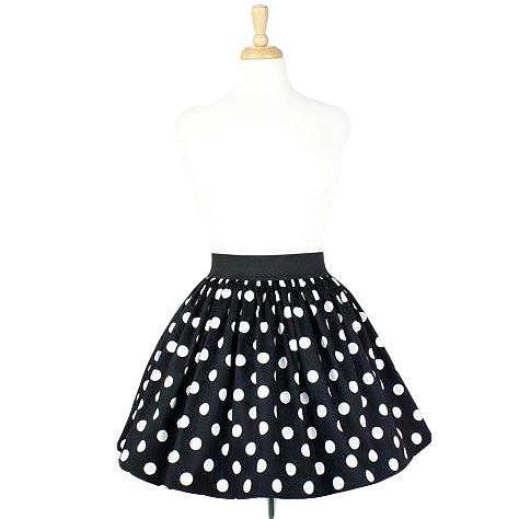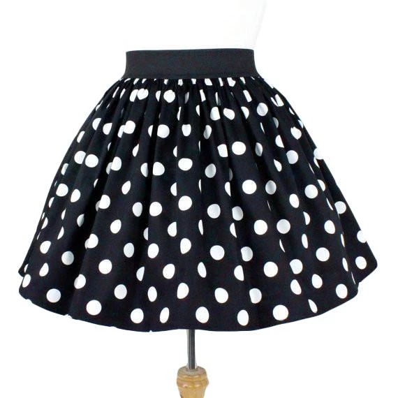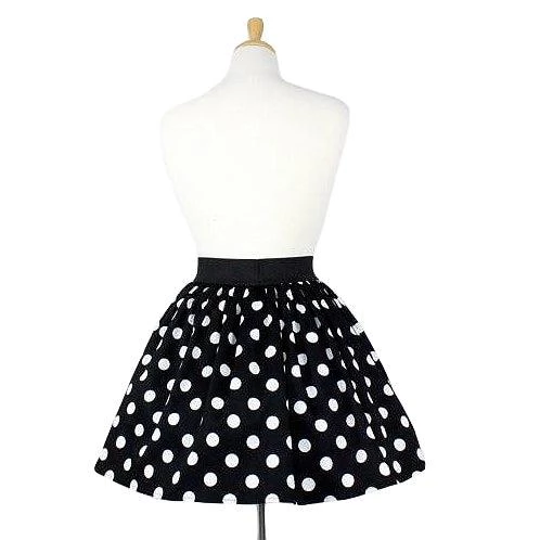 This beautiful black skirt with white polka dots is suitable for parties, holidays, and everyday! The wide elastic waistband has incredible stretch for a very accommodating fit, and pleats all around for a show-stopping 50’s-inspired silhouette!