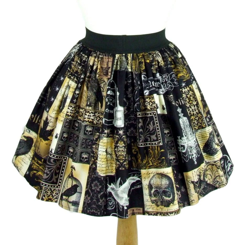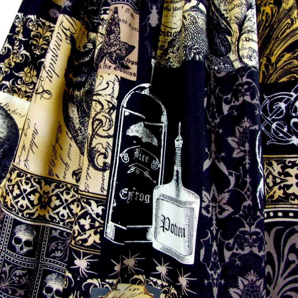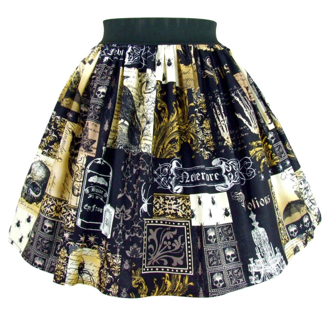 This amazing A-line skirt is inspired by Edgar Allan Poe’s classic, “The Raven.” The intricate print features beetles, bats, skulls, frogs, ravens, spiders, and of course, as the raven said, Nevermore. The wide elastic waistband has incredible stretch for a very accommodating fit. Made in the USA!