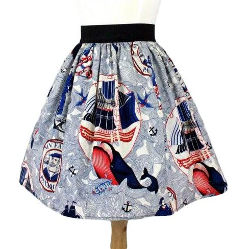 This amazing nautical inspired skirt from Hemet has skips, mermaids, anchors, sailors, and whales on a sketched wave background. The incredibly stretchy wide black elastic waist band and pleats all around combine for a very accommodating fit. Made in the USA!