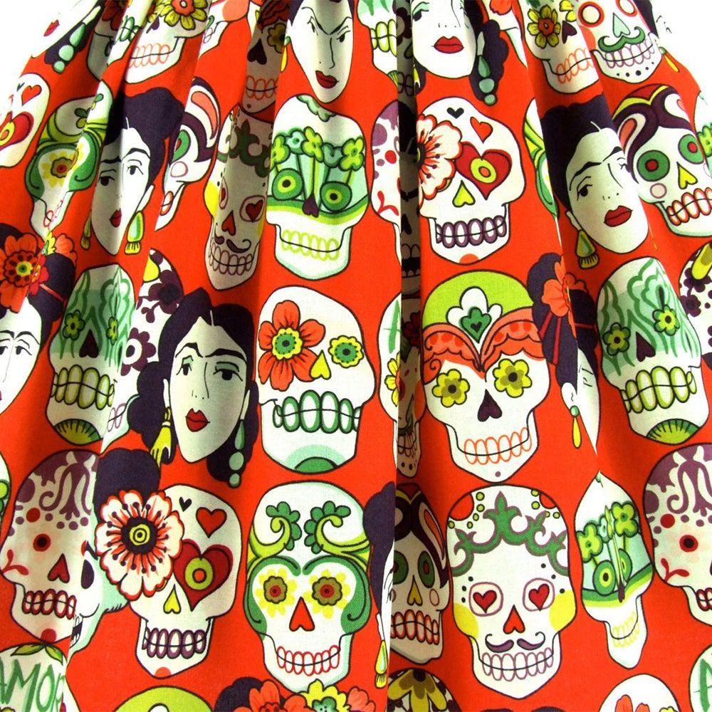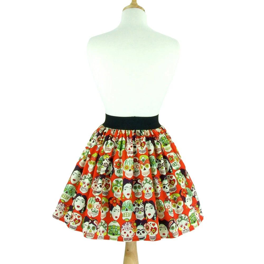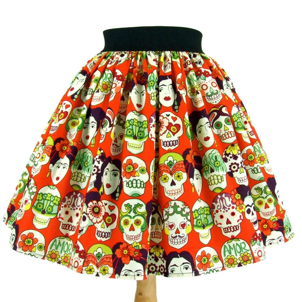 This gorgeous skirt from Hemet pairs Frida Kahlo with beautiful sugar skulls on an fiery background for a show-stopping look! The skirt features a black elastic waist band and pleats all around. The wide elastic waistband has incredible stretch for a very accommodating fit. Made in the USA!
