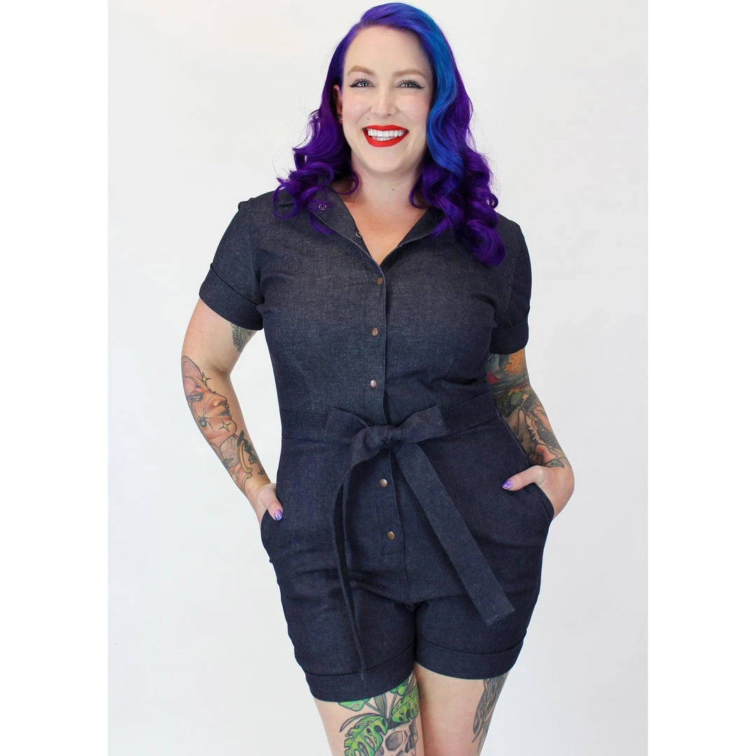This one-piece jumpsuit with short sleeves is a fun addition to any wardrobe! The jumpsuit features a front snap-up closure for easy dressing, long straps at the waist, a preppy collar, and two side pockets. This form-fitting jumpsuit hugs your curves and has a little stretch to it. Pair it with a headscarf and vintage flats, and you are set to go!