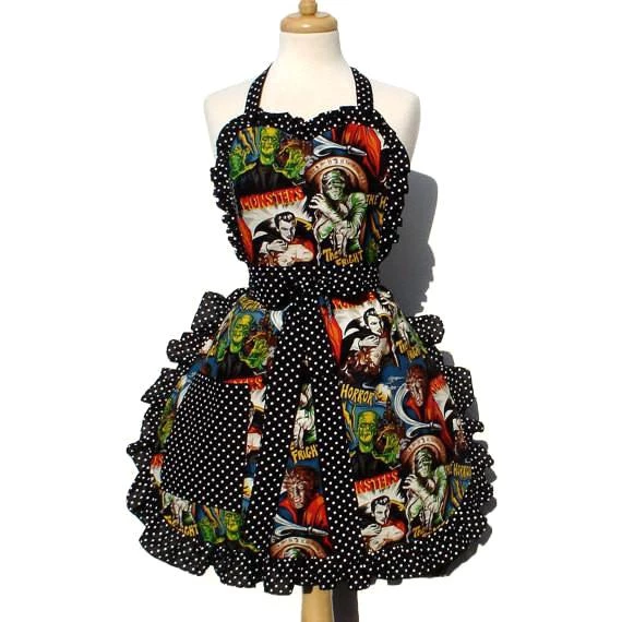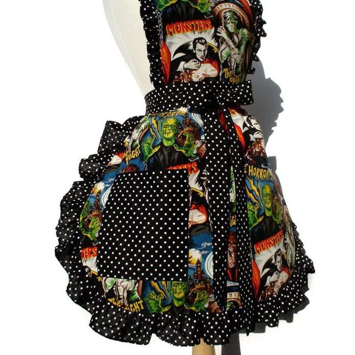 This apron features a variety of classic Hollywood monsters. Black and white polka dot trimming creates a nice little contrast against this Monster background. The adjustable straps are long and so more fitting to a variety of body types. One deep pocket comes in handy when juggling crafts and cooking.