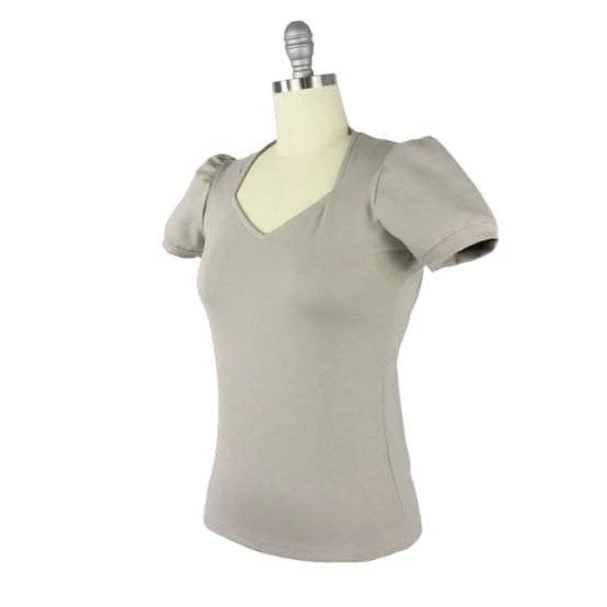 This stretchy top from Hemet is a perfect pinup staple all year round! The soft gray knit top has a flattering sweetheart neckline, gently puffed sleeves, and enough length to tuck it or leave it out.Â