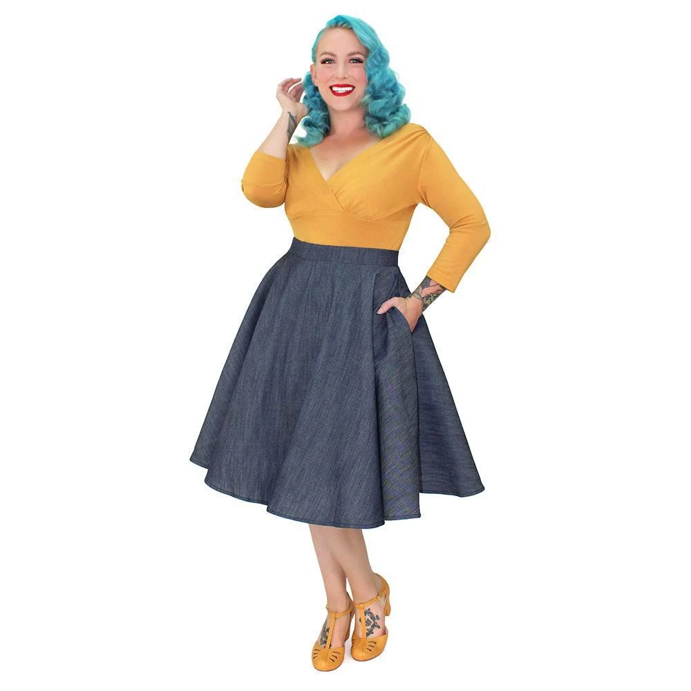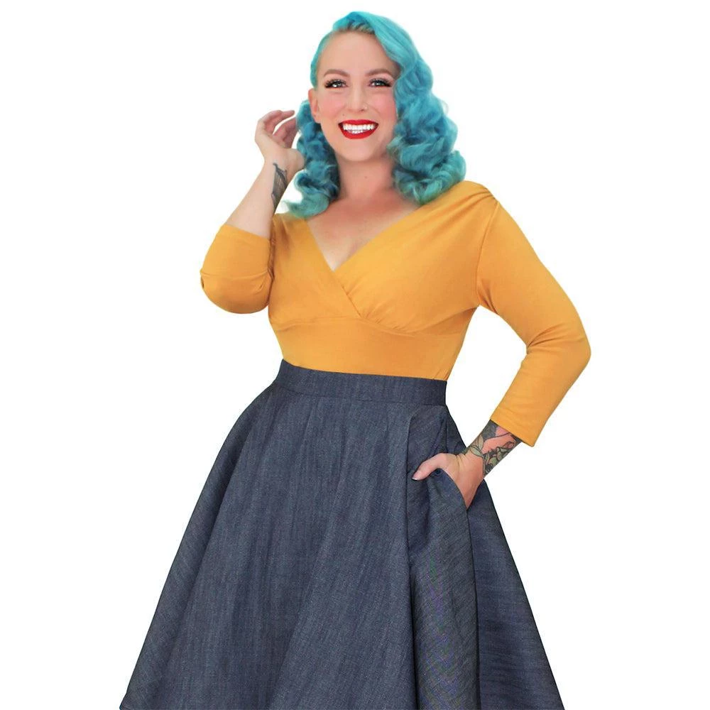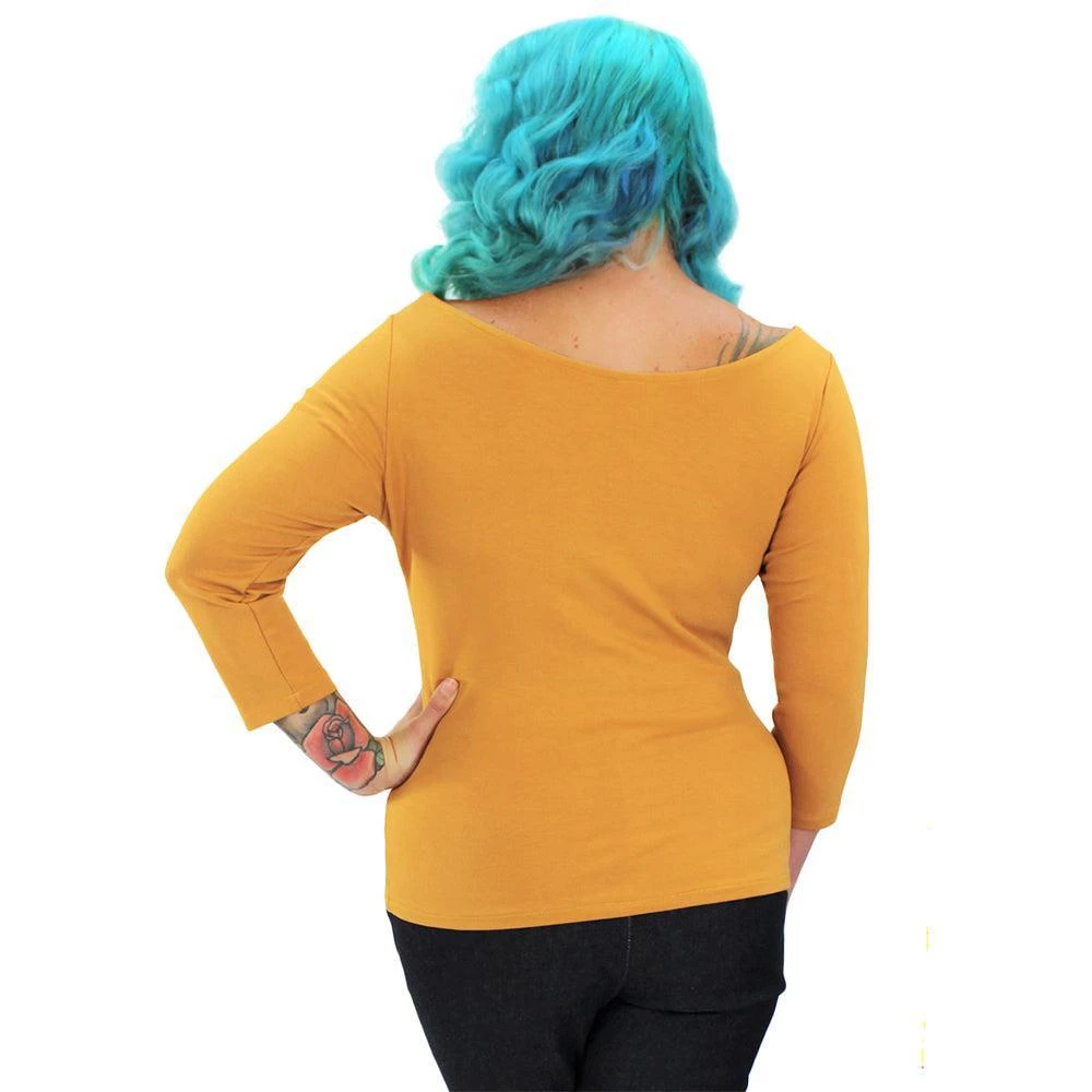 This stunning ’50s-inspired overlap top in mustard yellow is a comfortable and versatile staple for any pinup or rockabilly wardrobe! It features a wide v-neckline at the front, a round collar line at the back, three quarter sleeves, and an overlap of fabric at the bust. The material is lightweight, soft, and stretchy for extra comfort. Made in the USAÂ