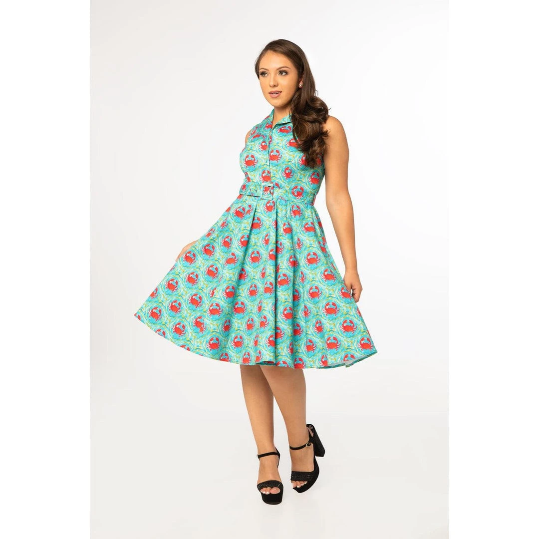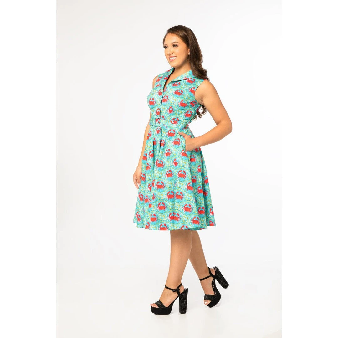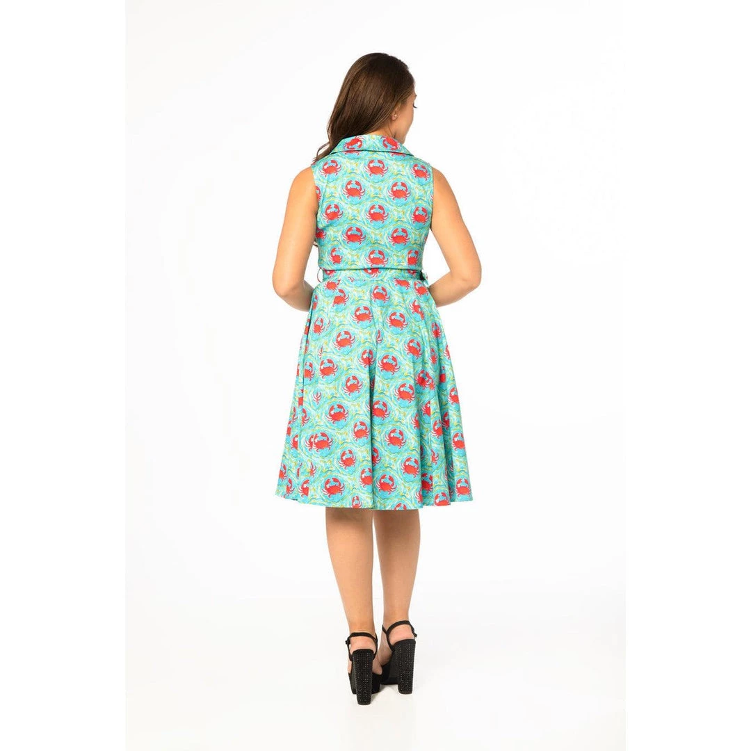 You’ll never feel crabby in this pretty swing dress from Miss Lulo! Made from a wonderful original print fabric with red crabs on an ocean blue background, the sleeveless A-line dress is so easy and fun to wear. It has a retro shirtwaist design with a v-neckline and front cloth covered buttons on the bodice. The swing skirt is nicely flared, there are side seam pockets, and a hidden zipper. A matching fabric belt completes the look.