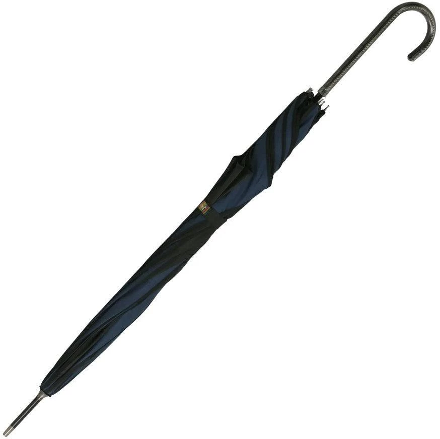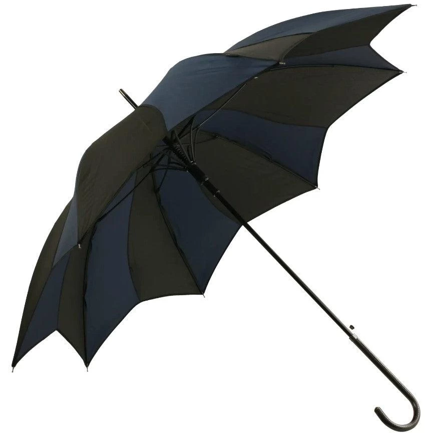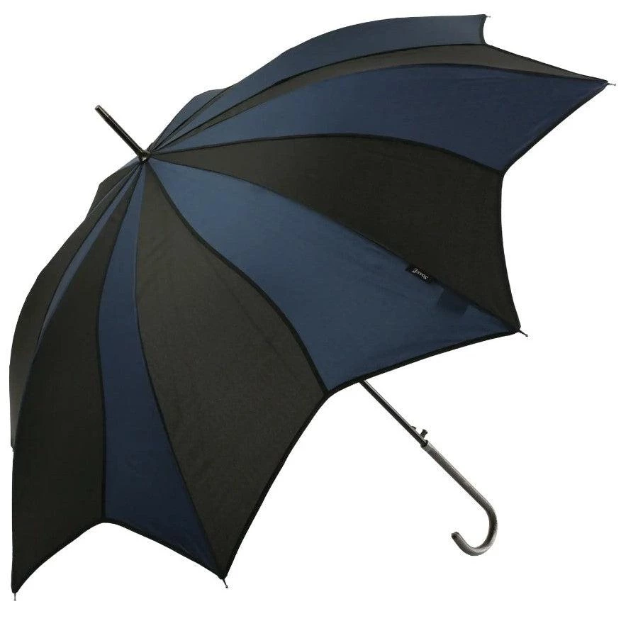 You’ll be singing in the rain when you carry this fabulous umbrella from Soake! The elegant swirls are created with alternating black and deep blue panels. The open canopy is 41″ in diameter and made from a polyester material that provides a very waterproof covering.  The walking-stick style is fun to carry even when closed, and is 35″ in length. It has fiberglass spokes that are strong, flexible, and long-lasting.  The handle is a classic hook shape with faux leather covering and a mechanism for automatic opening.Â
