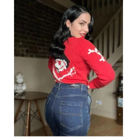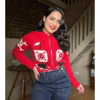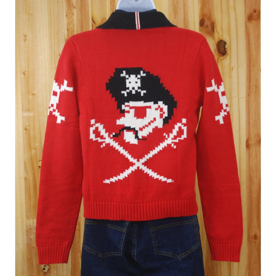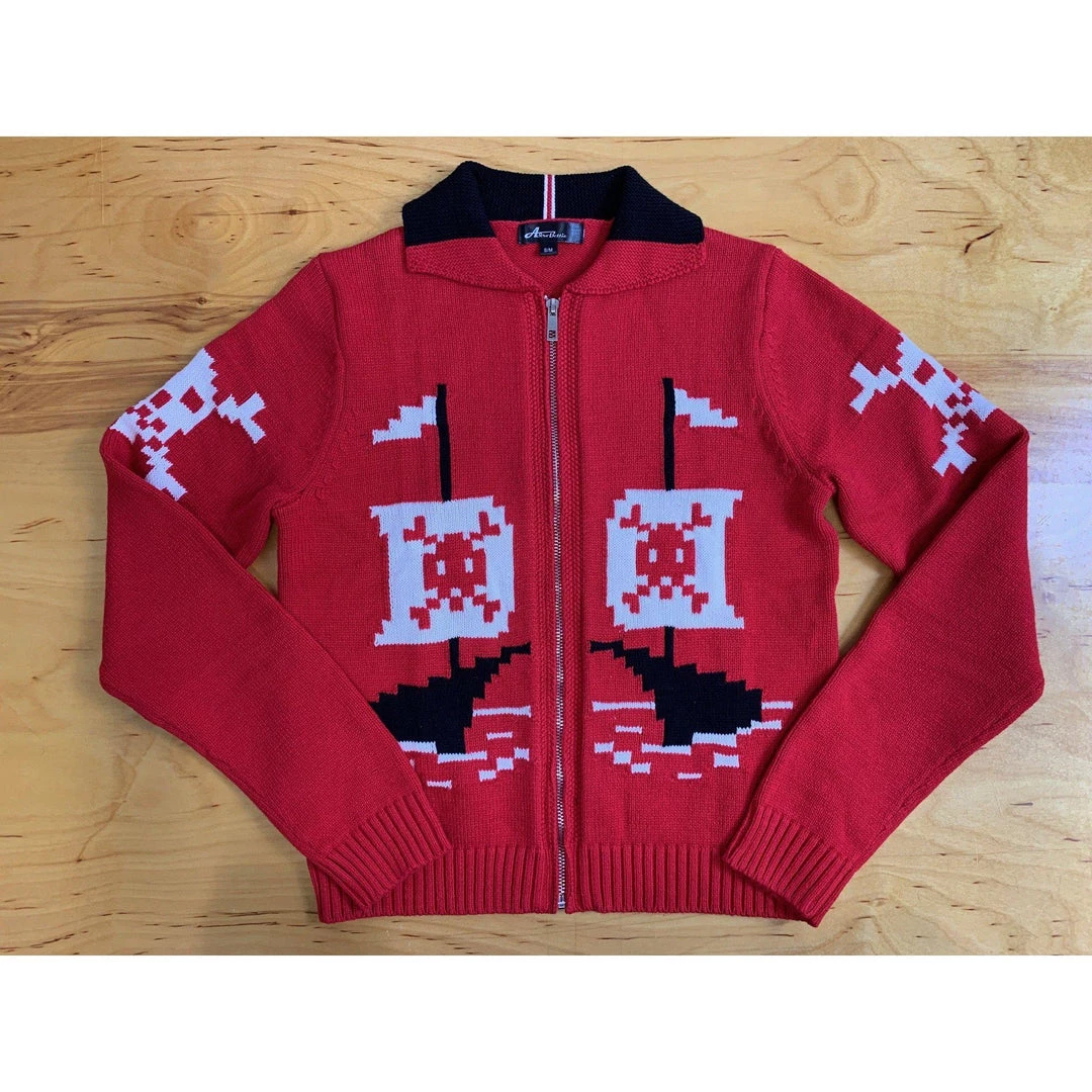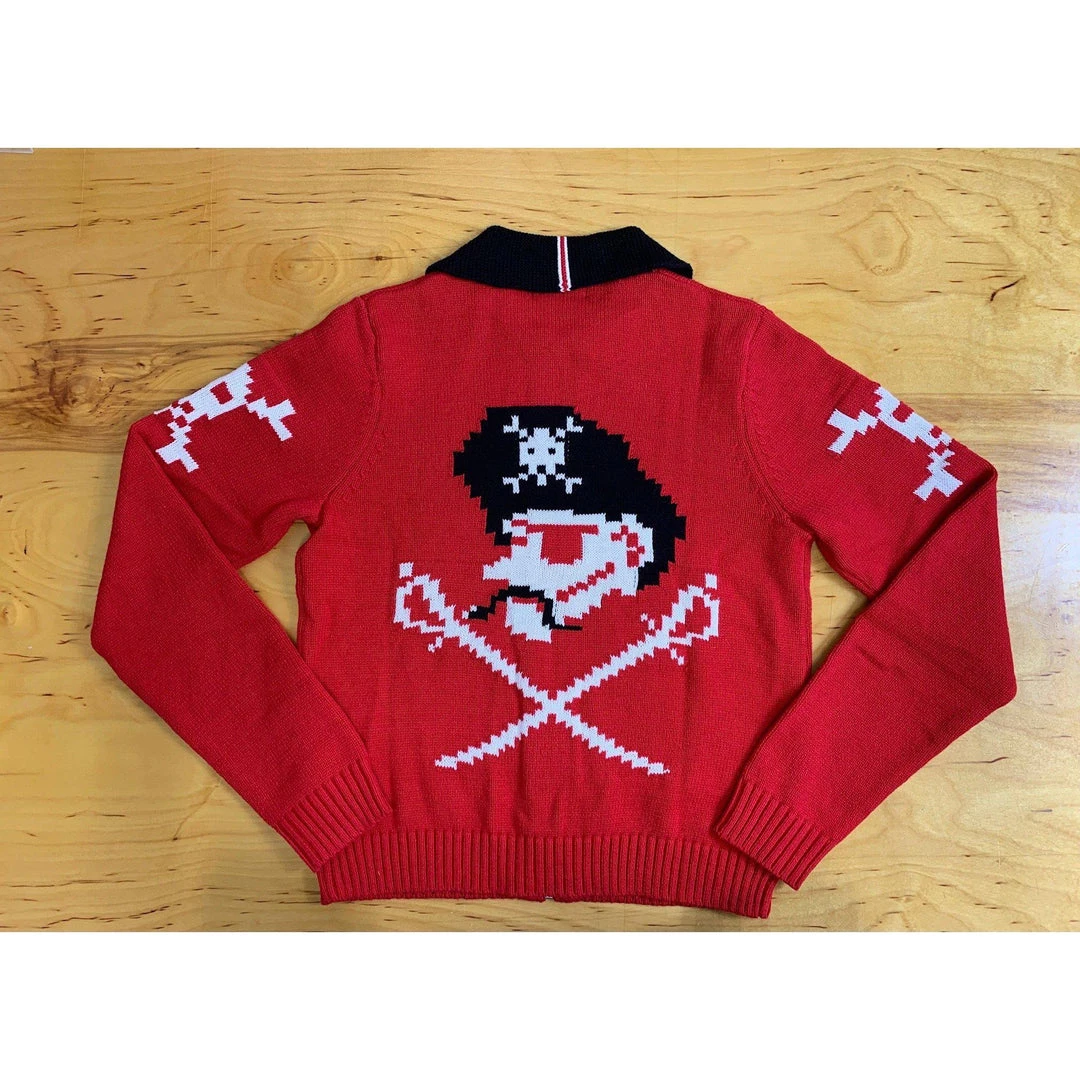 It’s a Pirate’s Life for me! This front zip-up knit jacket is a fun interpretation of the 50s Cowichan Pirate sweater, designed with a pirate ship on the front, a skull on the sleeve, and a pirate motif that attracts attention on the back.