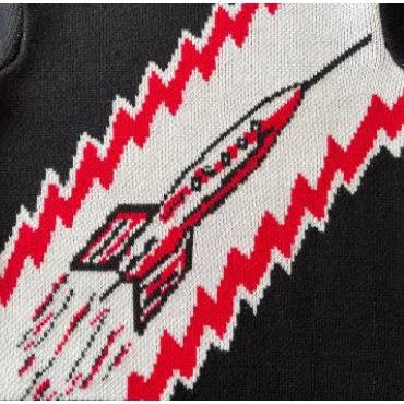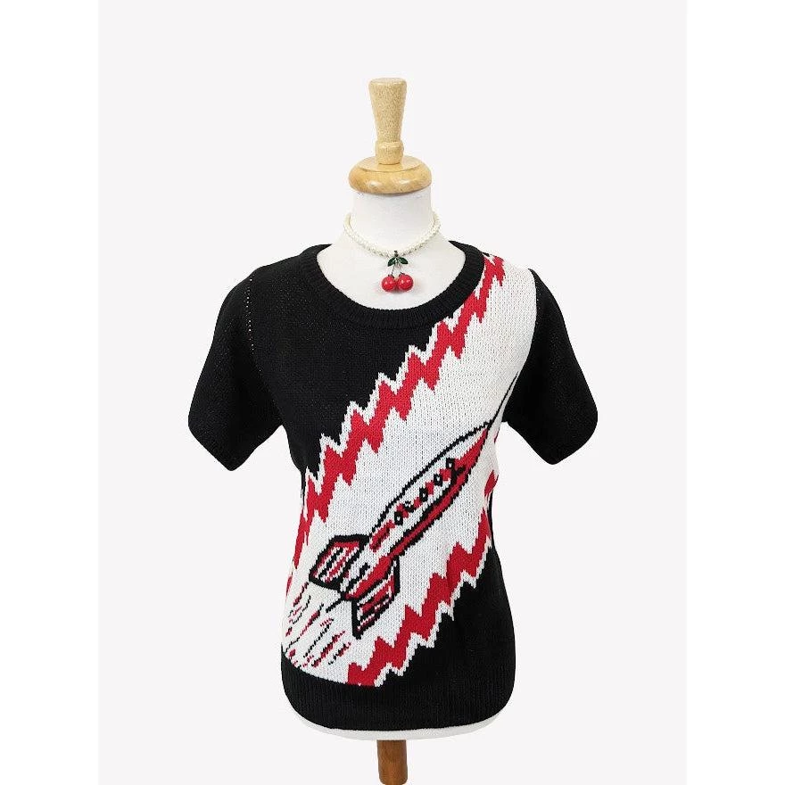 Go straight to the moon in this vintage rocket sweater! It has short sleeves, a round neck, and ribbing at the collar, cuffs, and hem. The red and cream rocket ship is on a black background.  Made with vegan acrylic yarn. Perfect with high-waisted jeans!  Blast off!!!