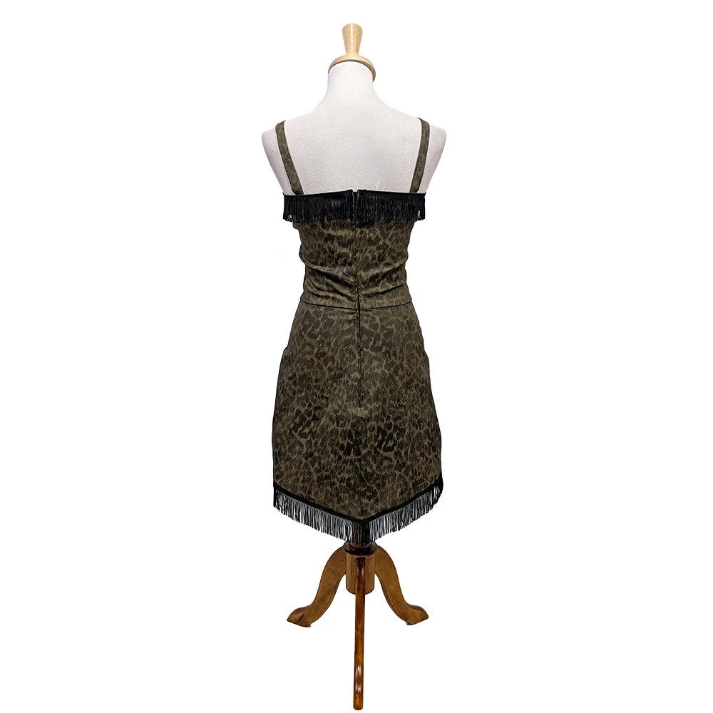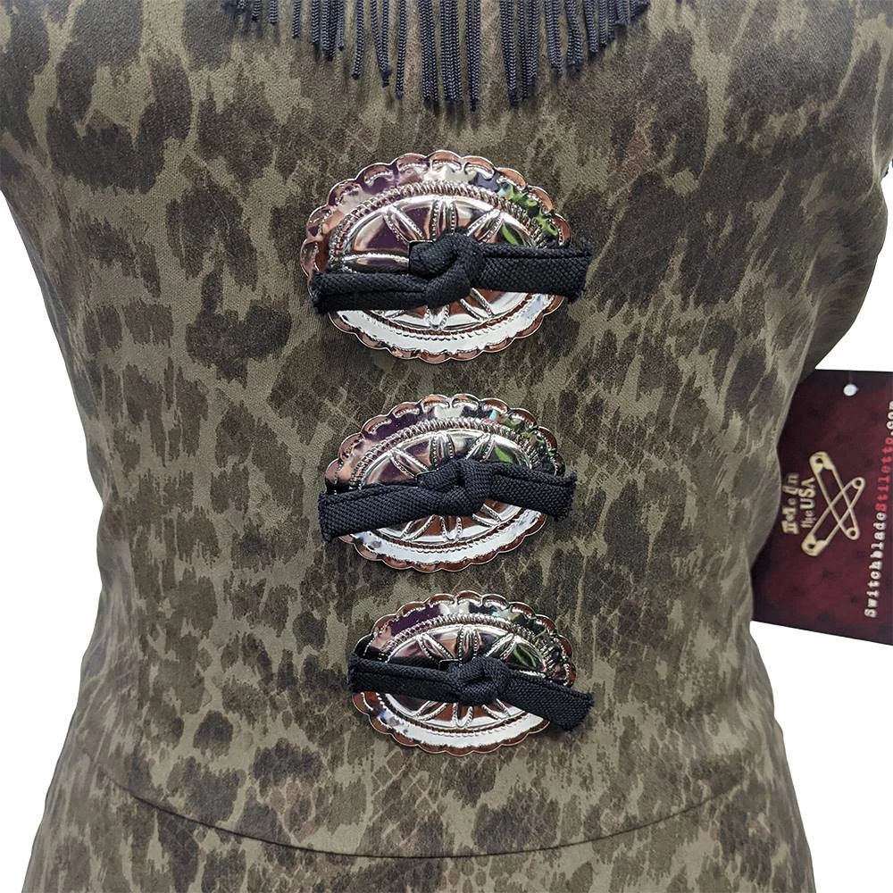 You can’t camouflage the benefits of this spectacular dress from Switchblade Stiletto! The fitted bodice features a sweetheart neckline and thin flat shoulder straps, and a short, diamond-shaped skirt. There are three shiny oval conchos down the center front. The bodice and hem are finished with sexy black fringe.