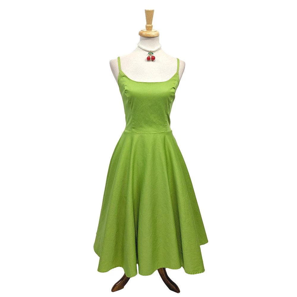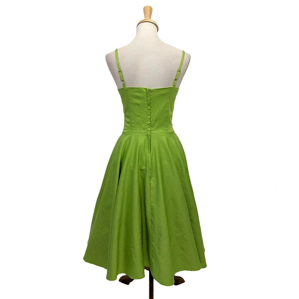 Swing and jive the night away in the Peggy full circle! This classic 1950’s inspired party dress is perfect for dressing up or dressing down. The vibrant peridot color in this cute fit and flare midi length silhouette is definitely a dress you will get plenty of wear out off, not to mention the compliments. Pretend you’re Ginger Rogers and go out there and tear up that dance floor all you boppers and Lindy hoppers out there. It has pockets and a back zipper with a hook & eye closure. 97%Cotton 3% Spandex