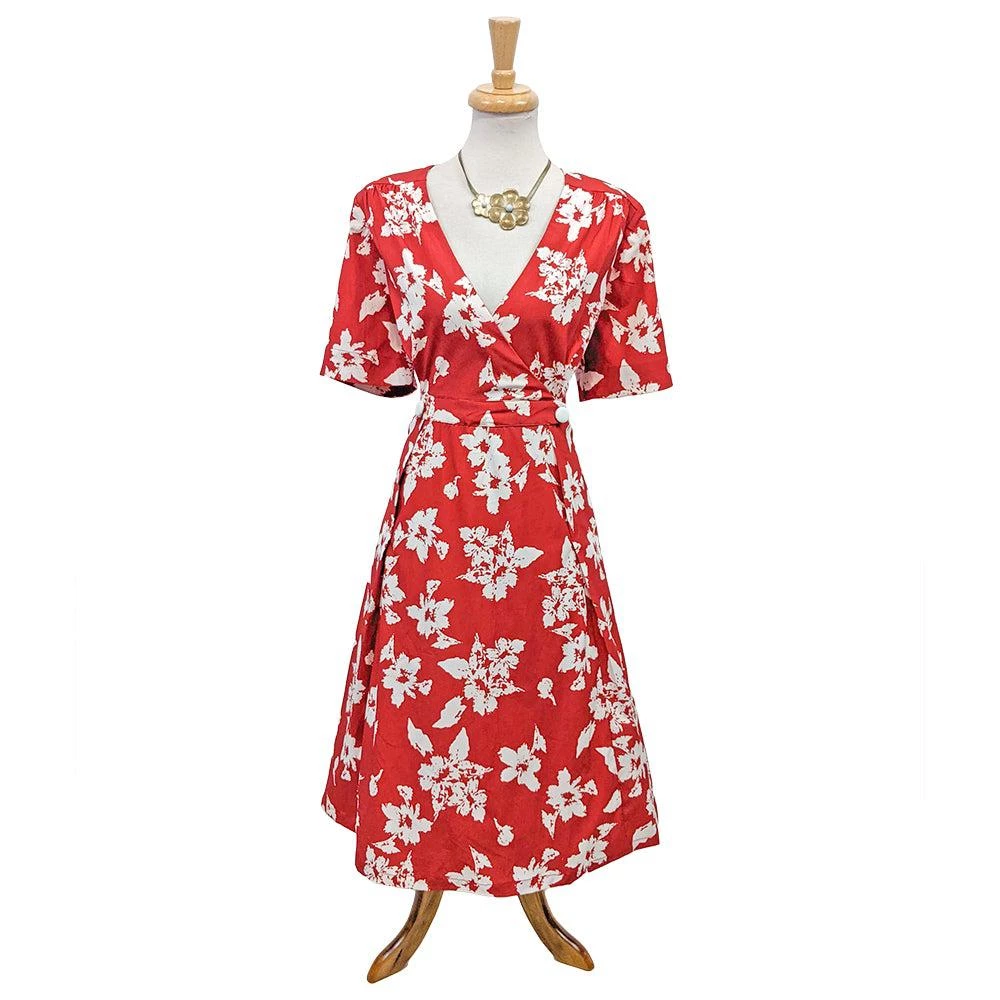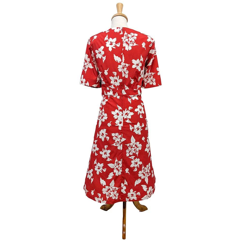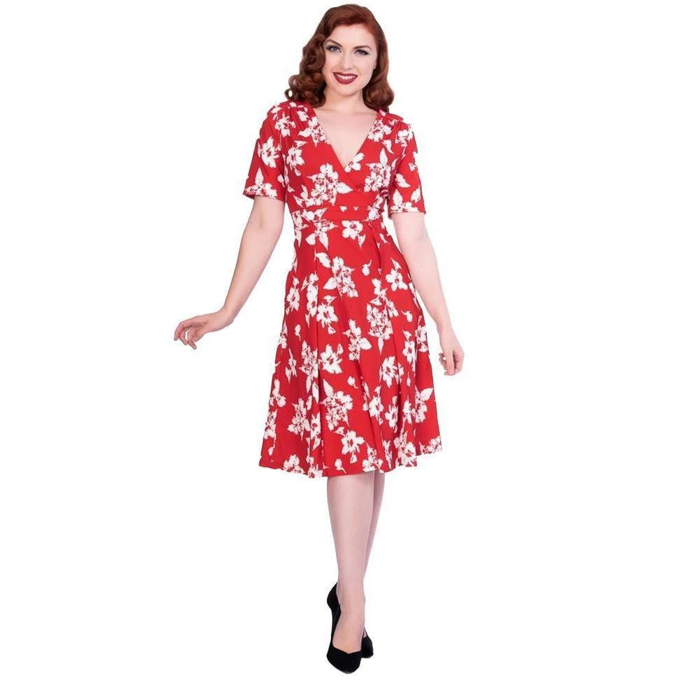 This vintage inspired floral print in red and white tones is cut to the much-loved tea dress silhouette and has a V neck at the front, half sleeves and falls to a floaty midi length.