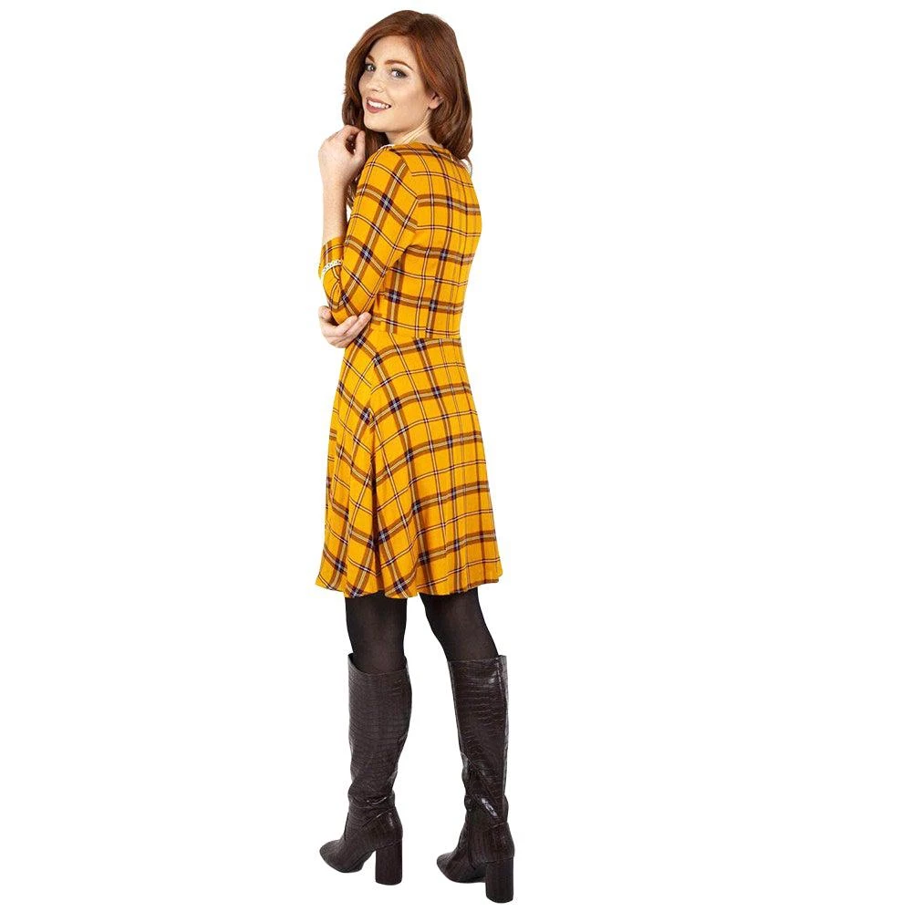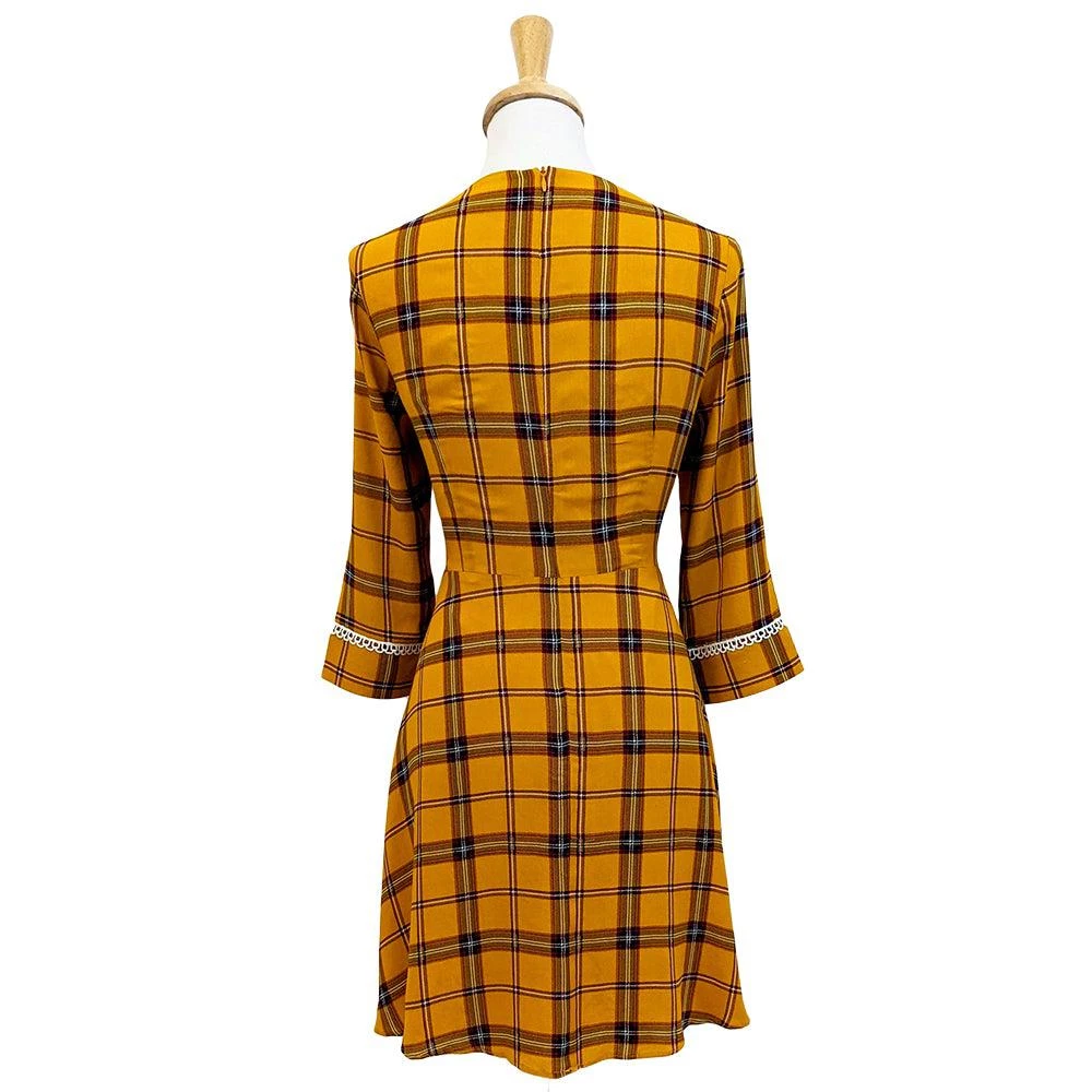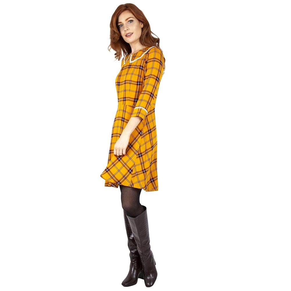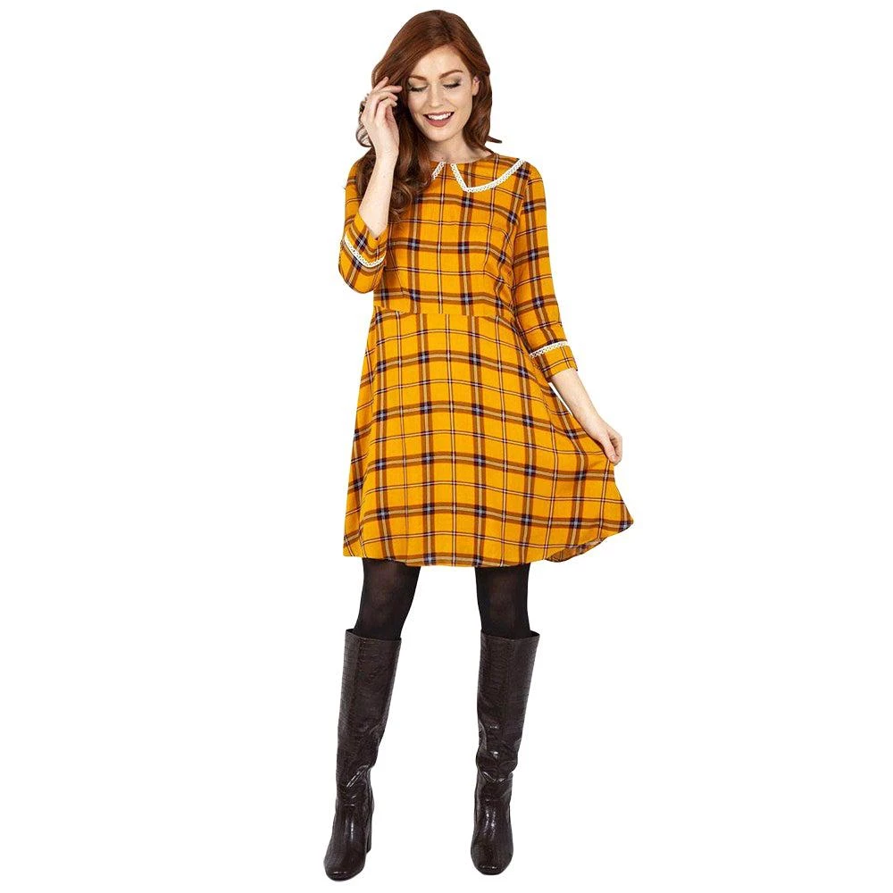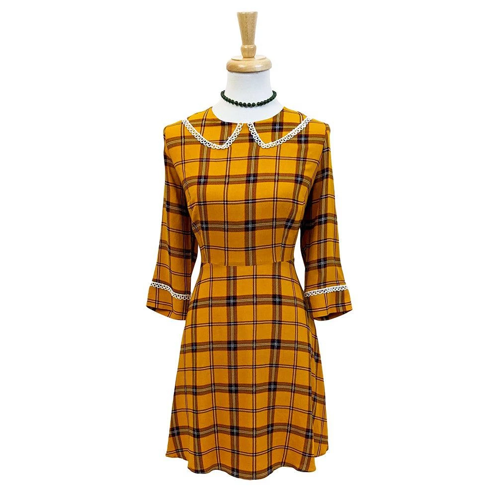 This Harley Shadow Collar Tartan Dress will keep you looking smart all year round. This 3/4 sleeve a-line dress has a sweet white lace trim on its elbow-length cuffs & Peter Pan collar. Center rear zip.