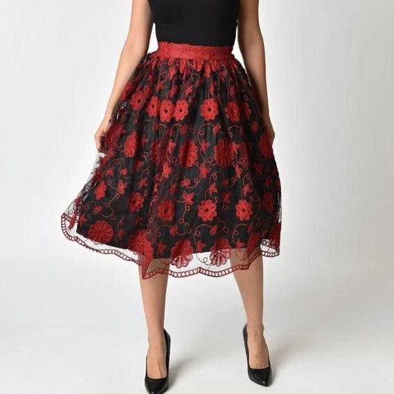 This stunning full skirt features embroidered red flowers on a black tulle backing. The waistband is red and the underskirt is black. It zips up the back. So sweet and feminine!